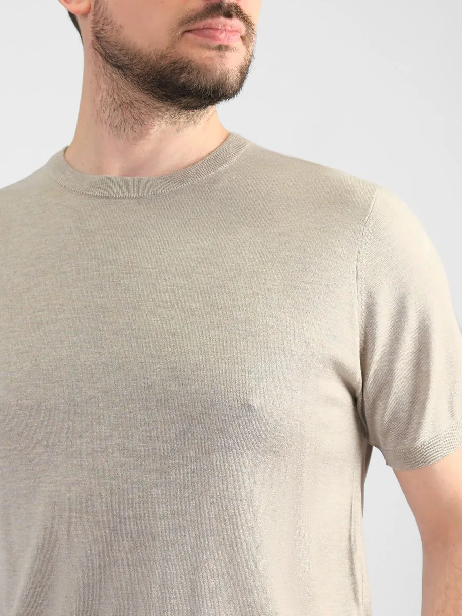 Мужская вязаная футболка с коротким рукавом и круглым воротом в серо-бежевом меланже – это воплощение непринужденной элегантности и комфорта в мужском гардеробе. Этот предмет одежды объединяет в себе расслабленный стиль футболки и изысканность вязаного полотна, создавая универсальный вариант для различных ситуаций. Меланжевая текстура, полученная путем смешивания серого и бежевого оттенков, придает футболке глубину и визуальный интерес, делая ее более выразительной, чем однотонные аналоги.