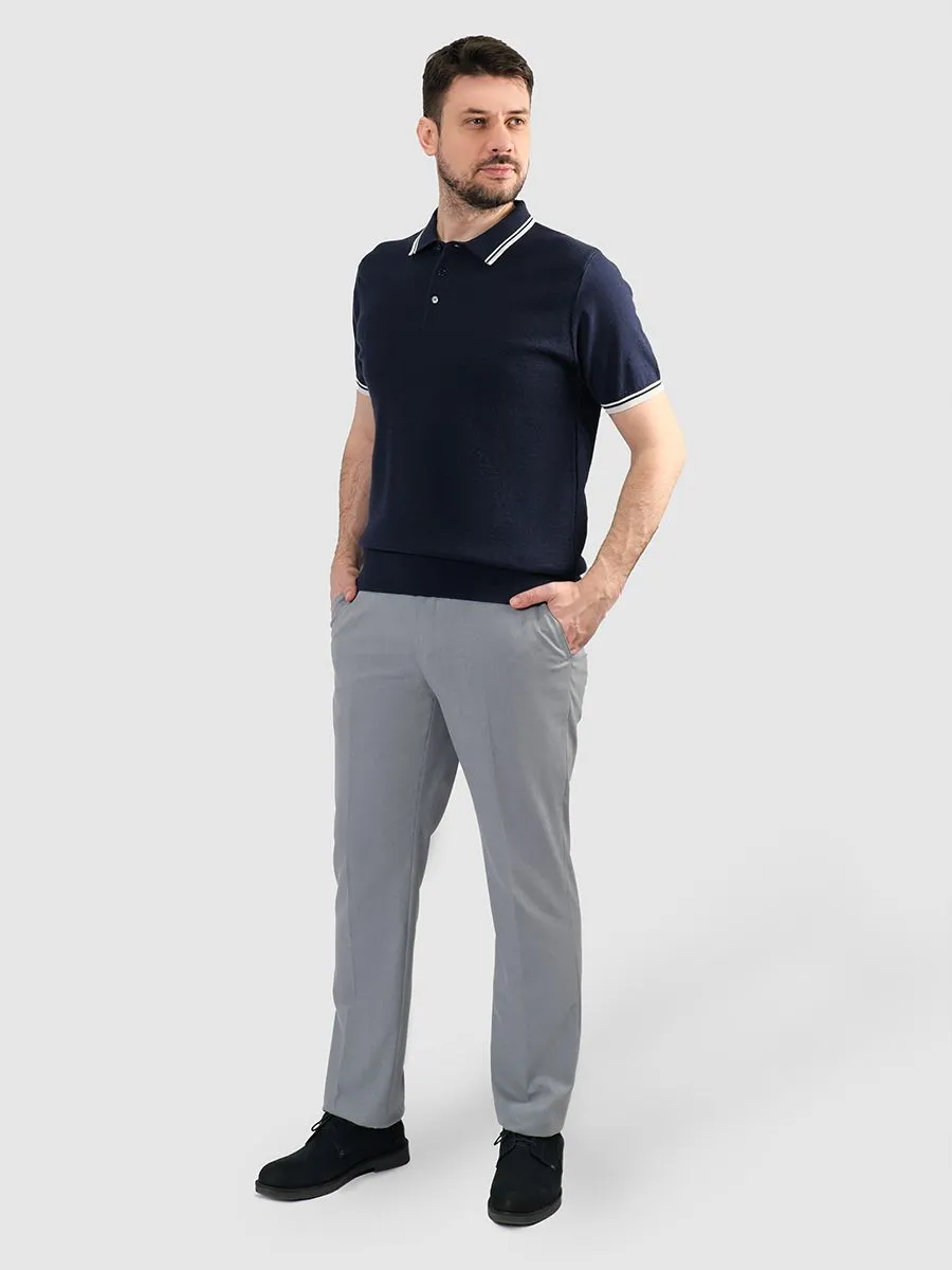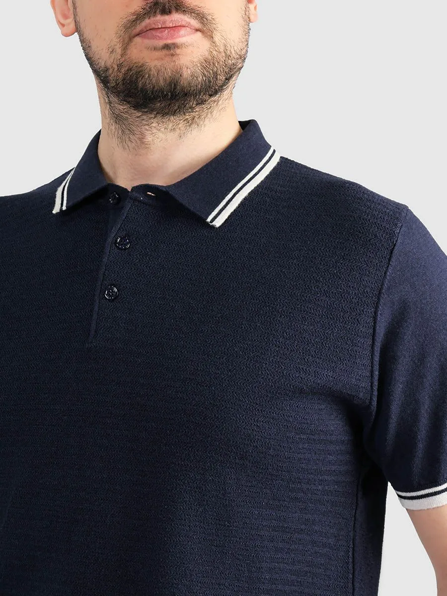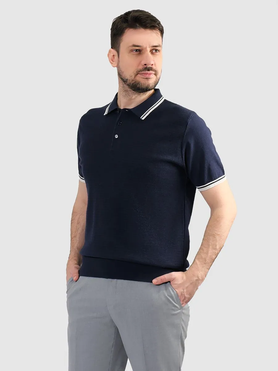 Это поло сочетает в себе комфорт хлопка и нежность кашемира, создавая ощущение роскоши на коже. Мелкий жаккардовый узор на передней части добавляет изысканности и текстуры, делая эту модель интереснее, чем обычное однотонное поло. Использование новой пряжи в составе подчеркивает стремление к инновациям и высокому качеству.Тёмно-синий цвет – это классика, которая всегда в моде. Он легко сочетается с различными элементами гардероба, будь то брюки чинос, джинсы или брюки. Белые полоски по краям воротника и рукавов придают свежести и спортивного шика, делая образ более динамичным и молодежным.Это поло идеально подойдет для создания стильного и непринужденного образа. Его можно носить как в повседневной жизни, так и на более формальные мероприятия, например, на встречу с друзьями или деловой ужин. Благодаря сочетанию хлопка и кашемира, поло обеспечивает комфорт в любую погоду.