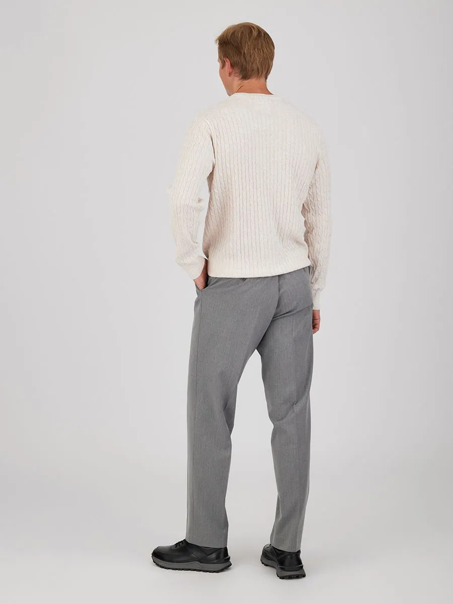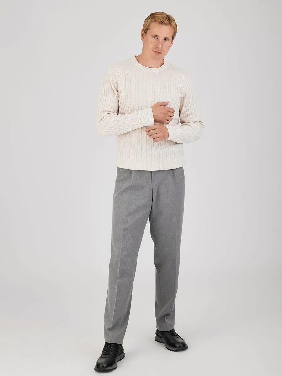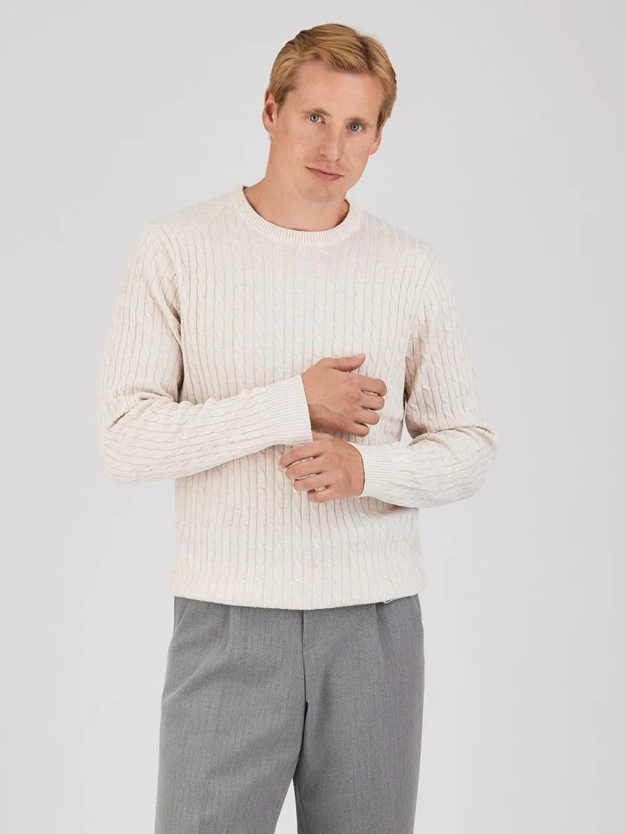 Этот светло-бежевый мужской джемпер станет неотъемлемой частью гардероба современного мужчины. Искусно выполненный из смесовой ткани, состоящей из полиэстера, нейлона, акрила и небольшой добавки шерсти, он сочетает в себе комфорт, практичность и долговечность. Оригинальный жаккардовый узор «косички», покрывающий весь джемпер, придает ему изысканный вид и делает его прекрасным выбором для создания стильных образов в прохладную погоду.