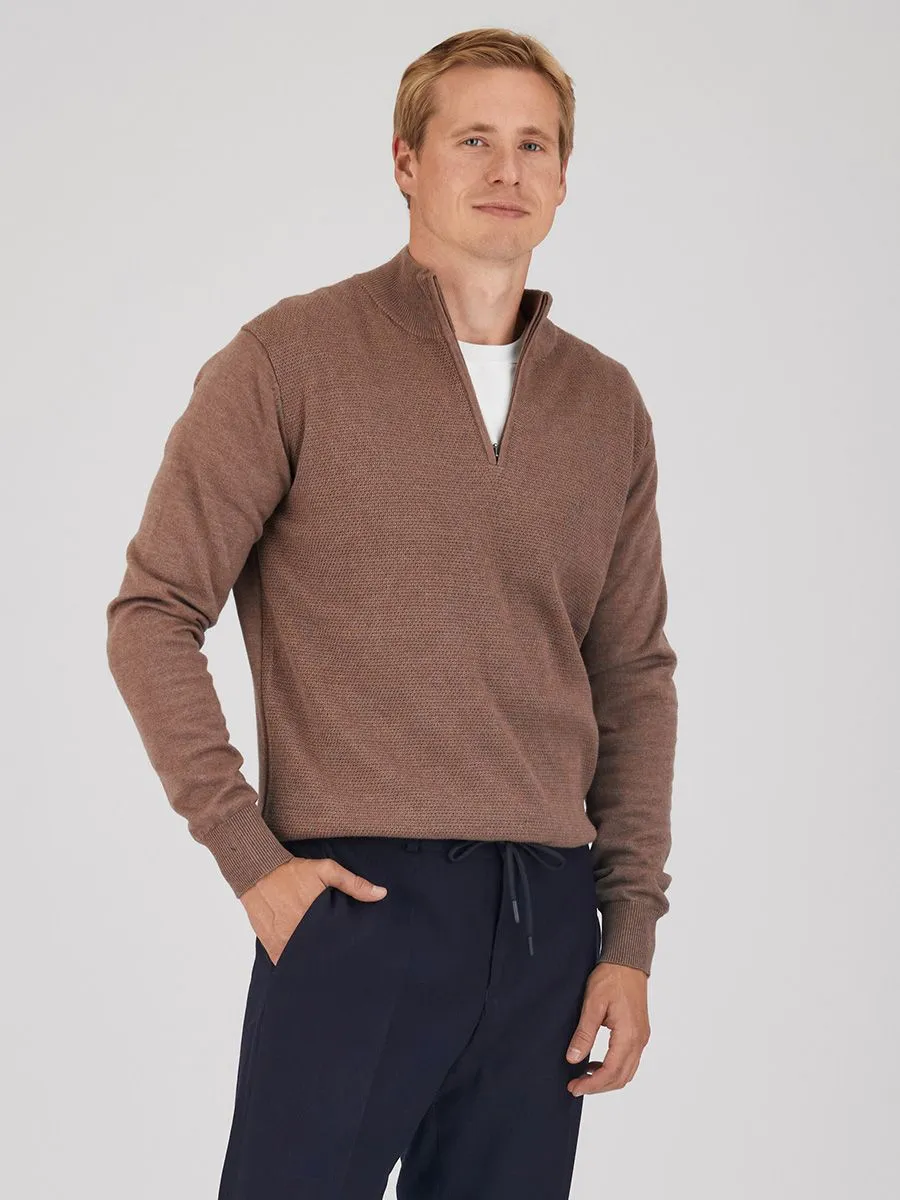 Элегантный мужской свитер в глубоком, уютном тёмно-бежевом оттенке станет незаменимым элементом вашего гардероба. Сочетание 50% хлопка и 50% акрила обеспечивает оптимальный баланс между комфортом и долговечностью. Изысканный мелкий жаккардовый узор на передней части изделия добавляет утонченности, а удобная застёжка на молнию и воротник-стойка обеспечивают дополнительную защиту от холода и ветра, делая этот свитер идеальным выбором для прохладной погоды.