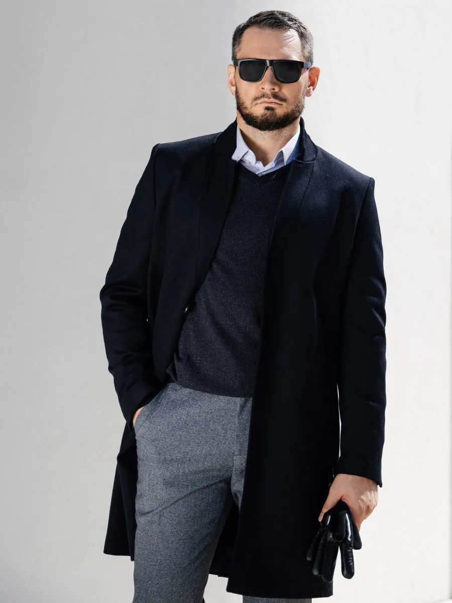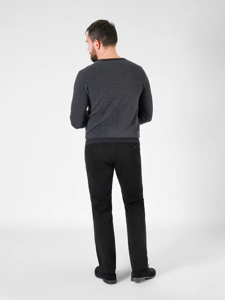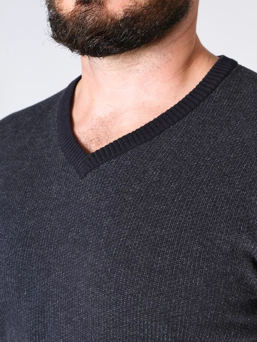 Мужской пуловер средней вязки темно-серого цвета -это универсальное решение для прохладной погоды. В нем будет комфортно находится в прохладном офисе и на улице, если надеть сверху пальто. У пуловера V-образный вырез, по низу изделия и рукавов проходит мягкая резинка. Ткань имеет мелкую меланжевую фактуру, то есть можно увидеть переплетения нитей разных цветов.