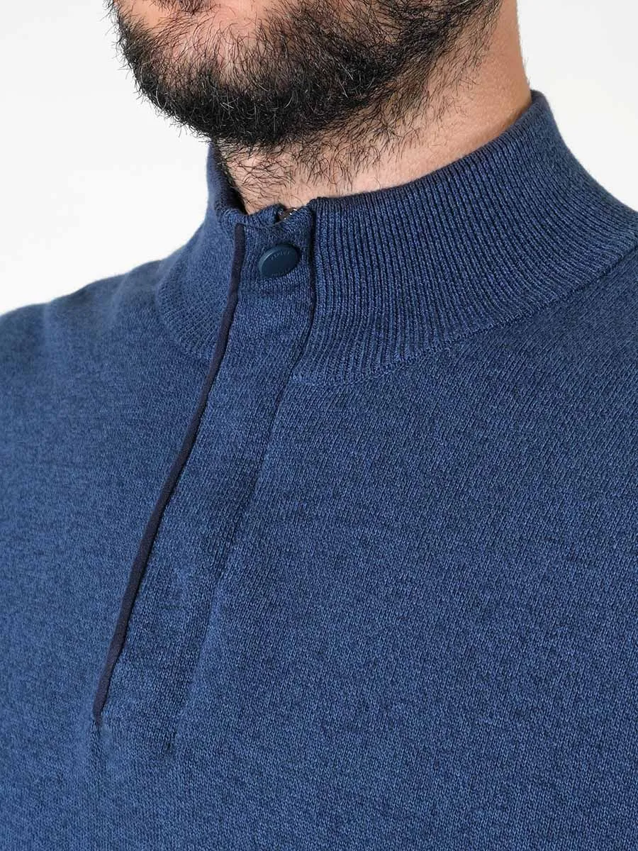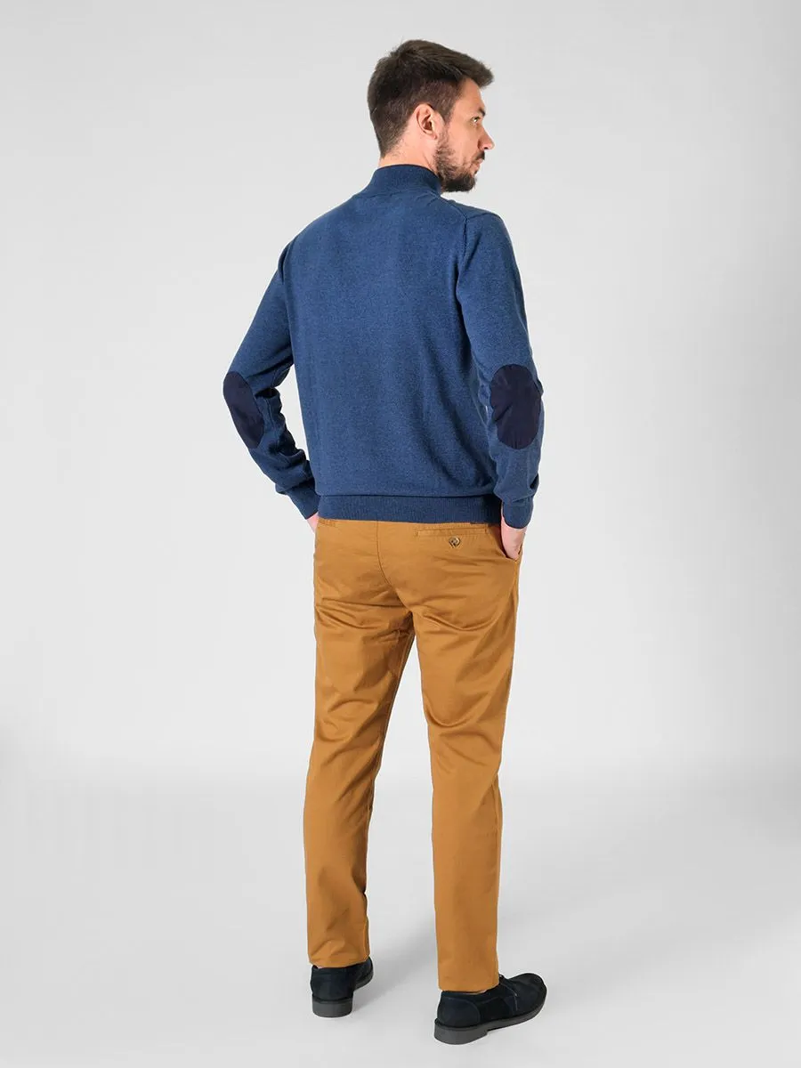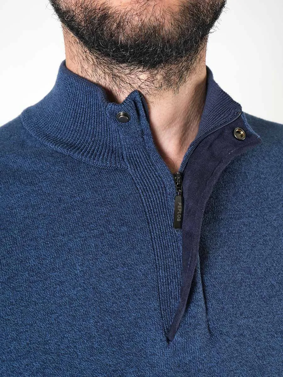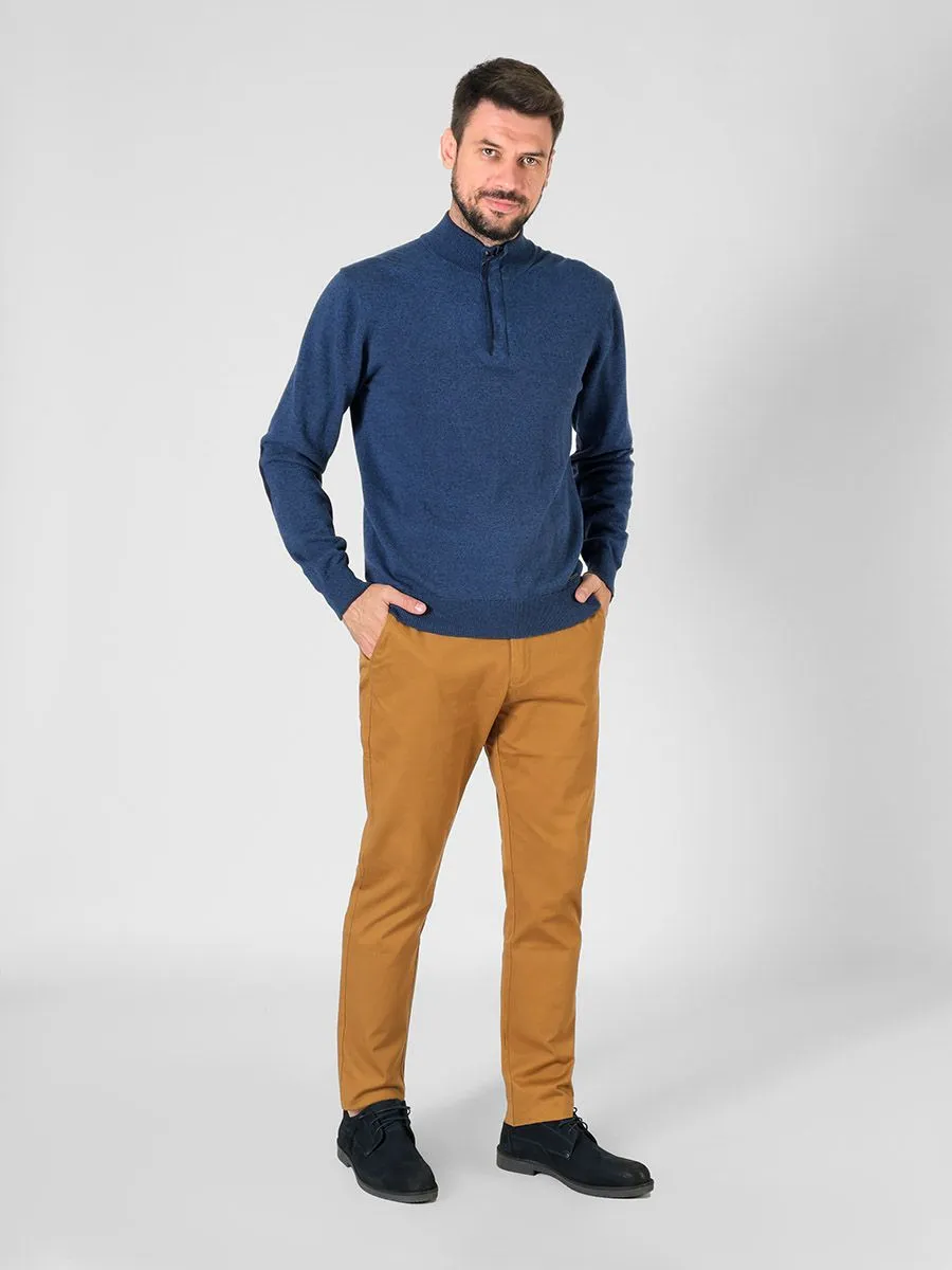 Стильный свитер в красивом синем цвете легко впишется в любой гардероб. Воротник-стойка - это практичное решение для холодного времени года. Воротник застегивается на молнию и кнопку, и декорирован замшевой вставкой с внутренней стороны. Такая же замшевая отделка в тон с основной тканью используется и на локтях, увеличивая их износостойкость. Монохромный хлопковый свитер станет уютным и модным элементом вашего гардероба. Брюки: P2405-SL.