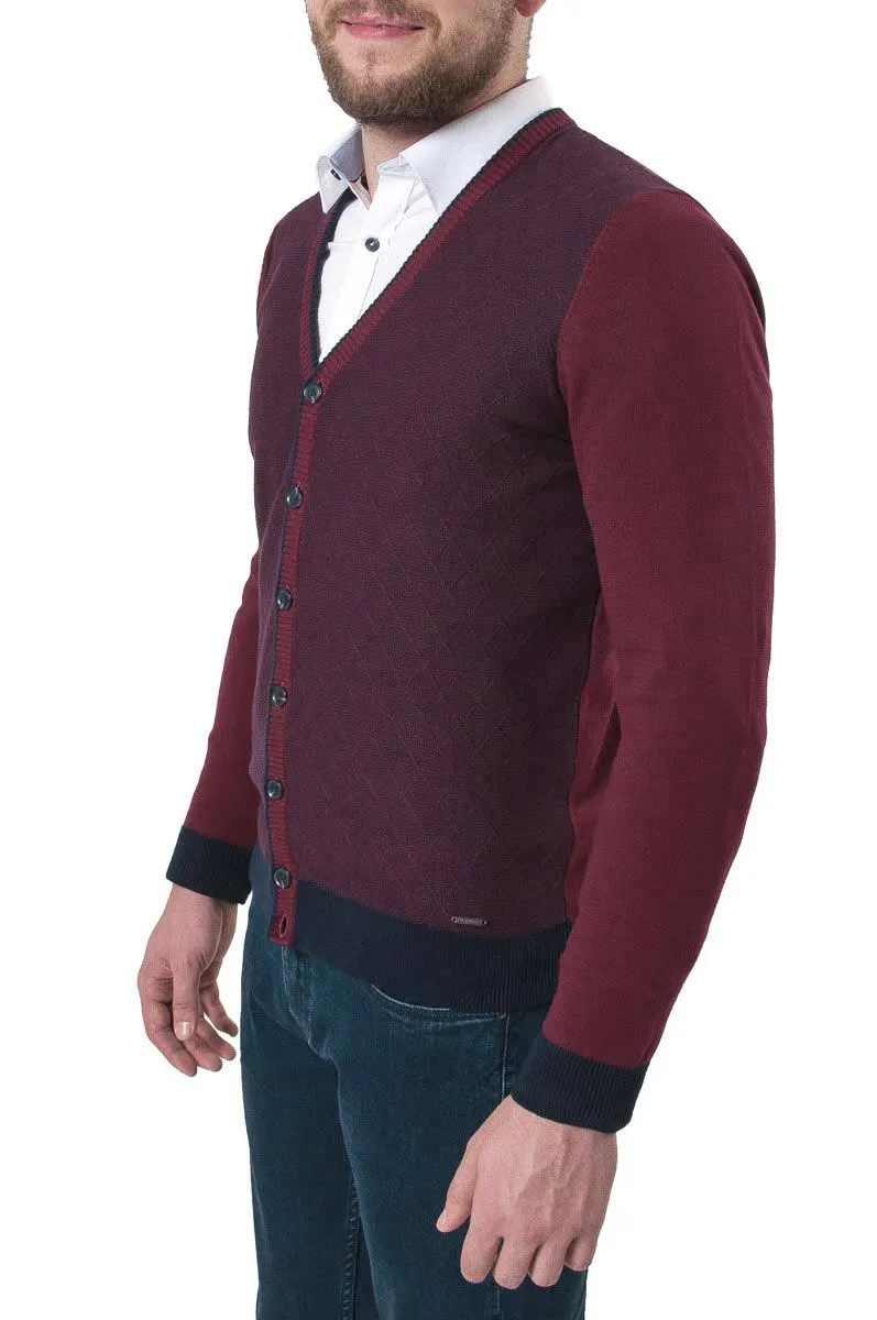 Бордовый кардиган, состоящий из 100% хлопка. Модель имеет V-образную горловину и застегивается на пуговицы. Лицевая часть имеет текстурный рисунок, а также нашитый металлический лейбл "Peplos". Низ и манжеты в черном цвете выполнены в виде резинок.