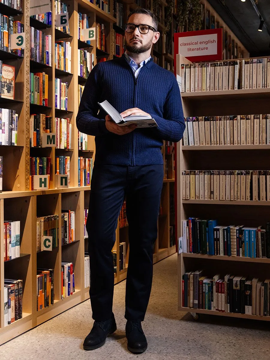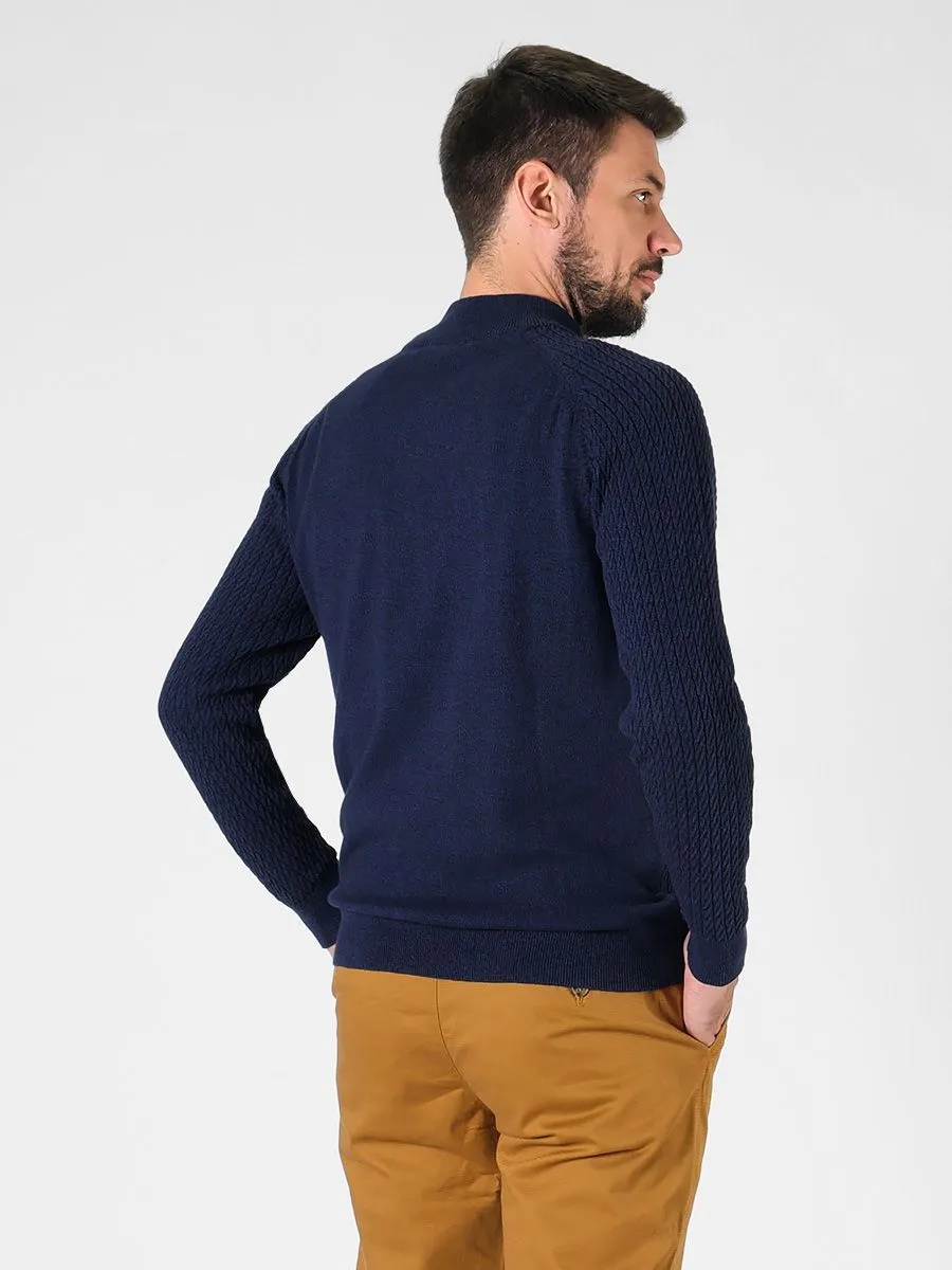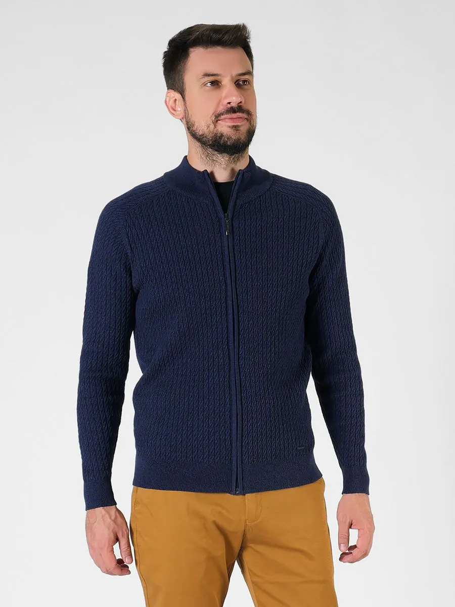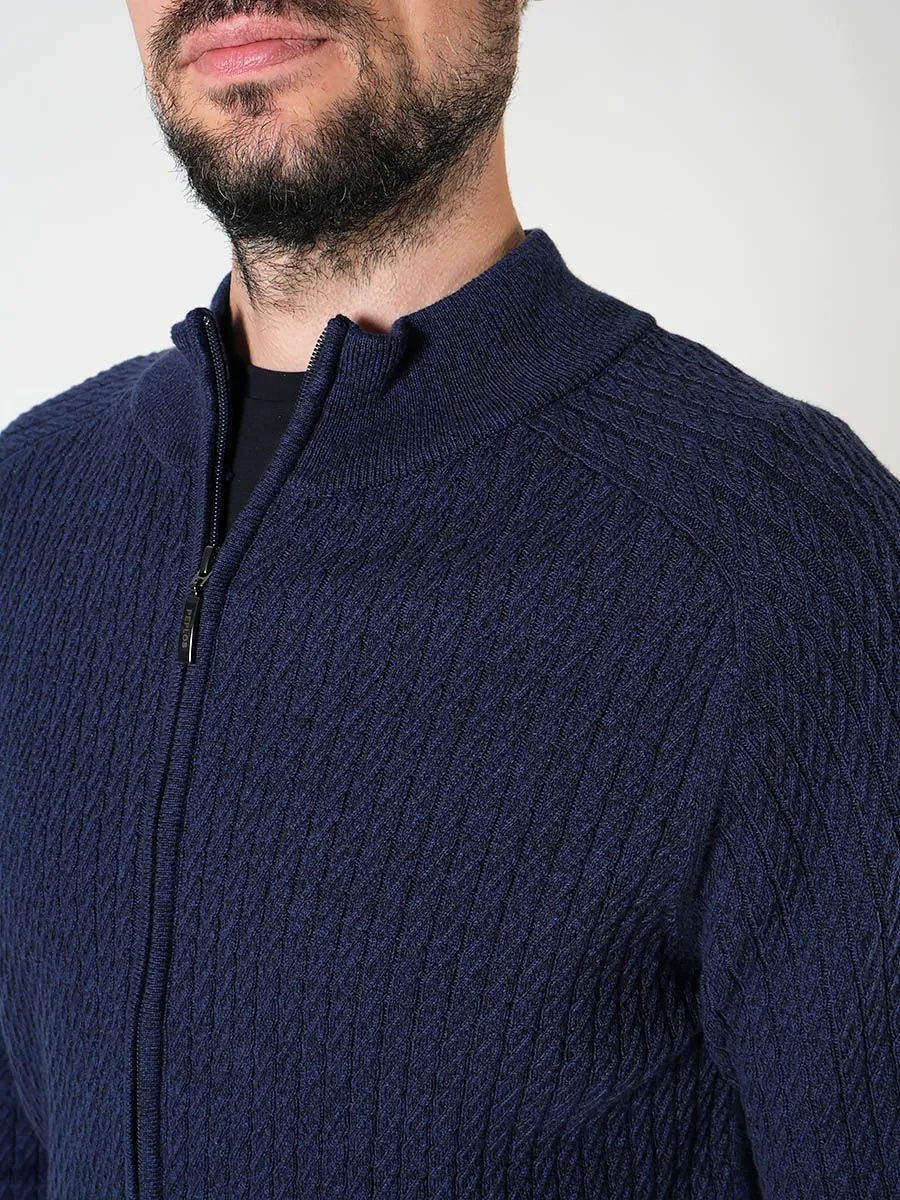 Деловой кардиган насыщенного темно-синего цвета изготовлен из 100% хлопка. Поэтому в нем будет комфортно находится весь день, благодаря дышащим свойствам хлопка. Подвижная центральная застежка - молния позволяет создавать разные варианты глубины выреза, поэтому если вы носите галстук, то кардиган можно расстегнуть до уровня груди, чтобы образ выглядел более интересно, а главное, было тепло и комфортно. Спереди идет фактурная вязка в виде вертикальных линий, а сзади уже гладкая вязка.