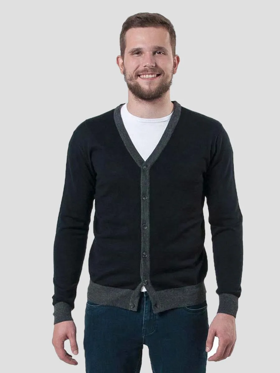 Темно-синий полушерстяной кардиган на пуговицах. Модель имеет V-образный вырез. Края изделия выполнены в сером цвете.