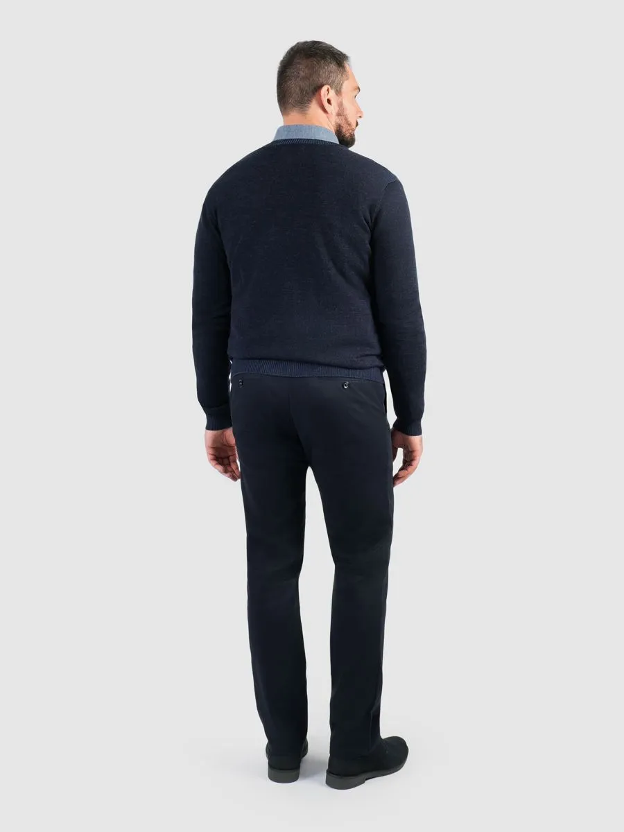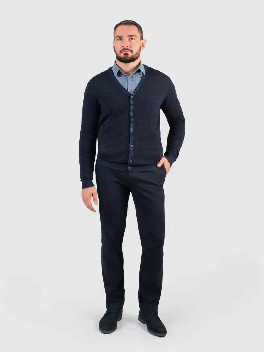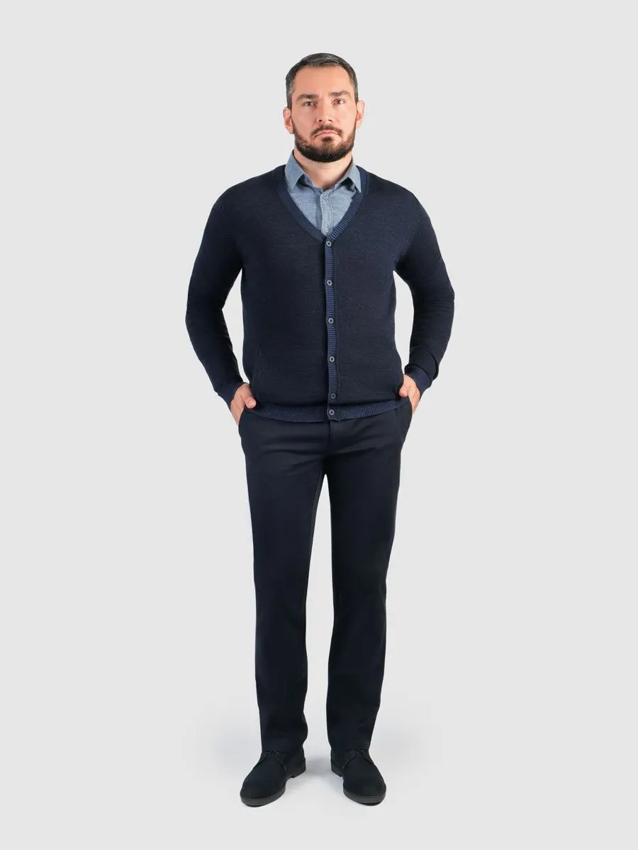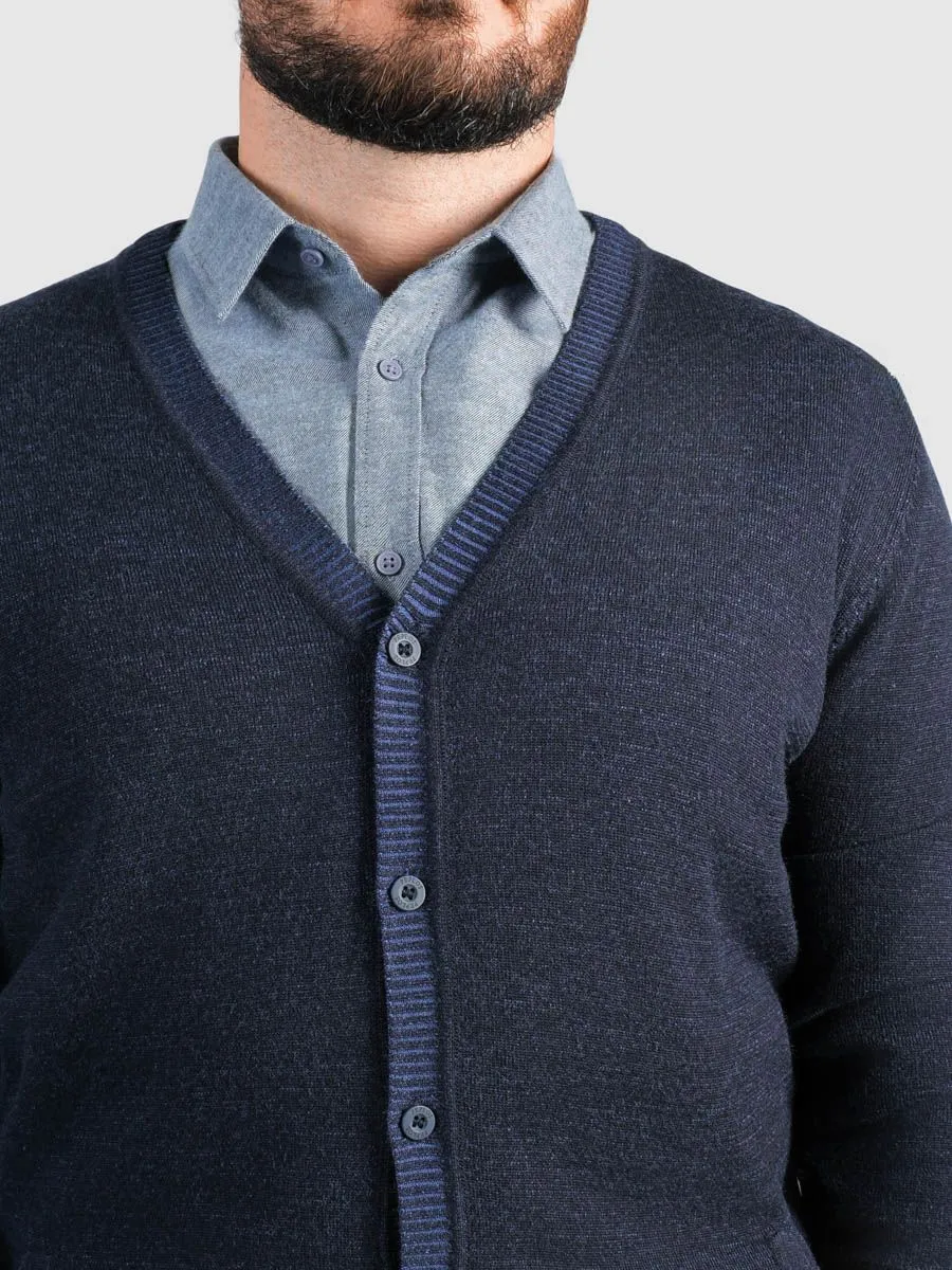 Мужской темно-синий кардиган на пуговицах представляет собой изысканное сочетание комфорта и элегантности. Глубокий тёмно-синий меланжевый цвет придаёт изделию роскошь и универсальность, гармонируя с разными элементами гардероба.Особенность кардигана в том, что он связан из пряжи двух цветов, благодаря чему лицевая и изнаночная стороны имеют разные оттенки, что добавляет дополнительную глубину и сложность дизайну изделия.