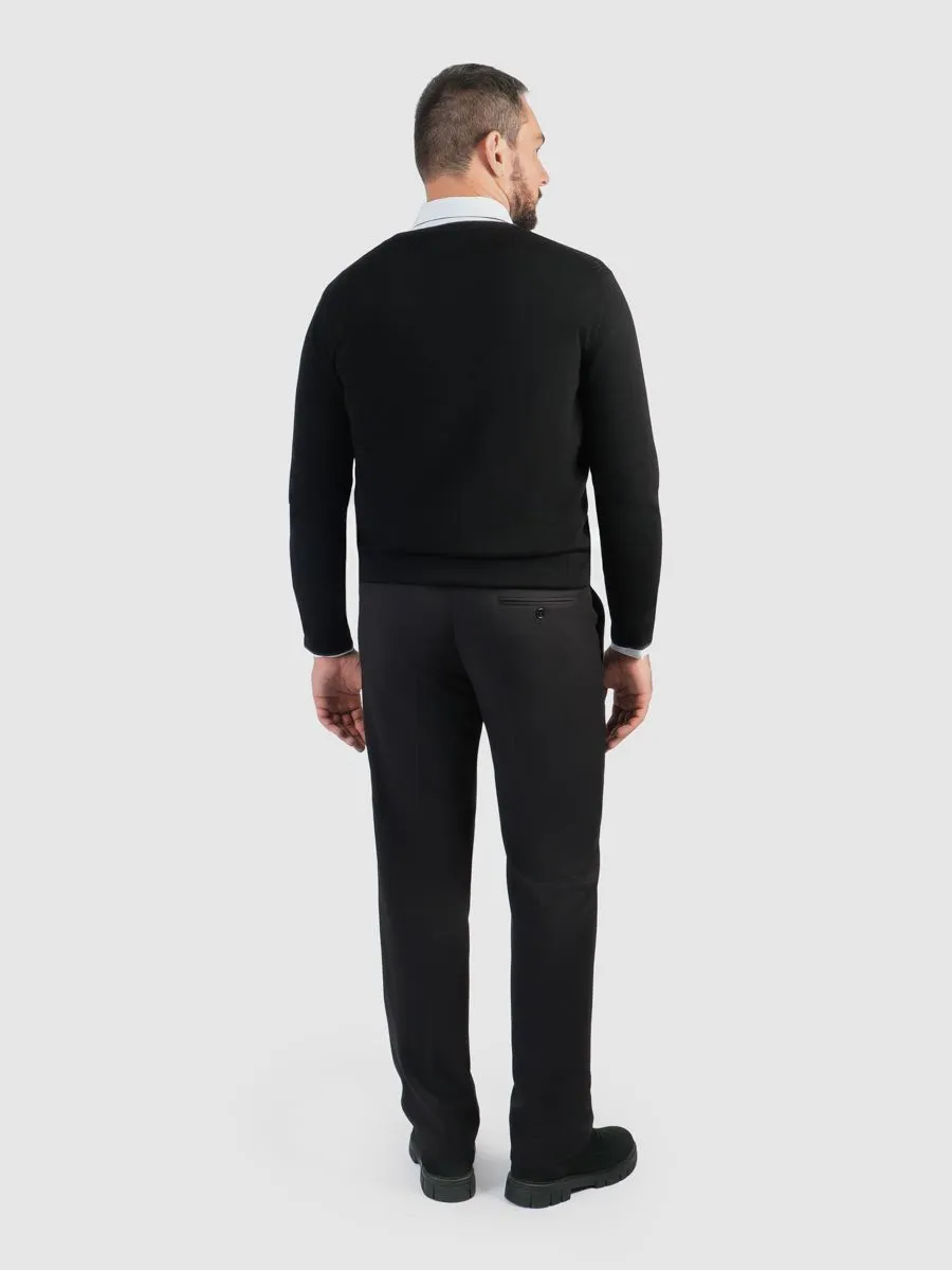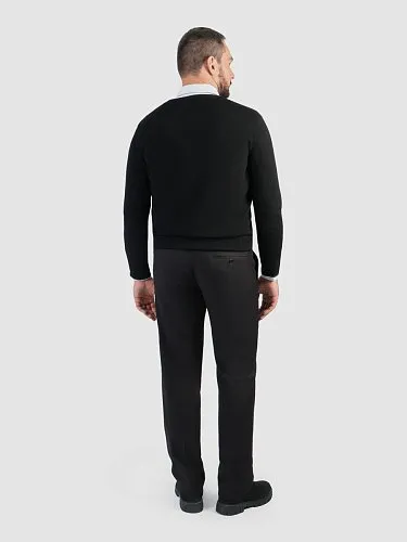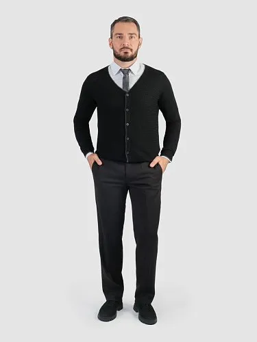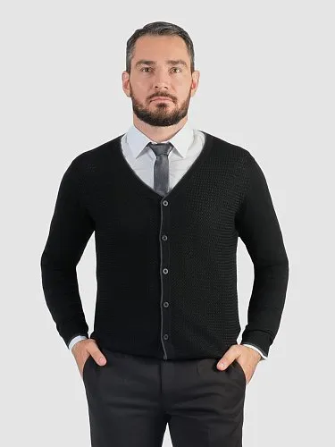 Изюминка данного черного кардигана заключается в изумительном жаккарде, украшающем переднюю часть изделия. По краям кардиган украшен графитовыми полосками, которые гармонично дополняют общий вид. Пряжа и жаккард выгодно подчёркивают стиль и элегантность этого элемента гардероба.