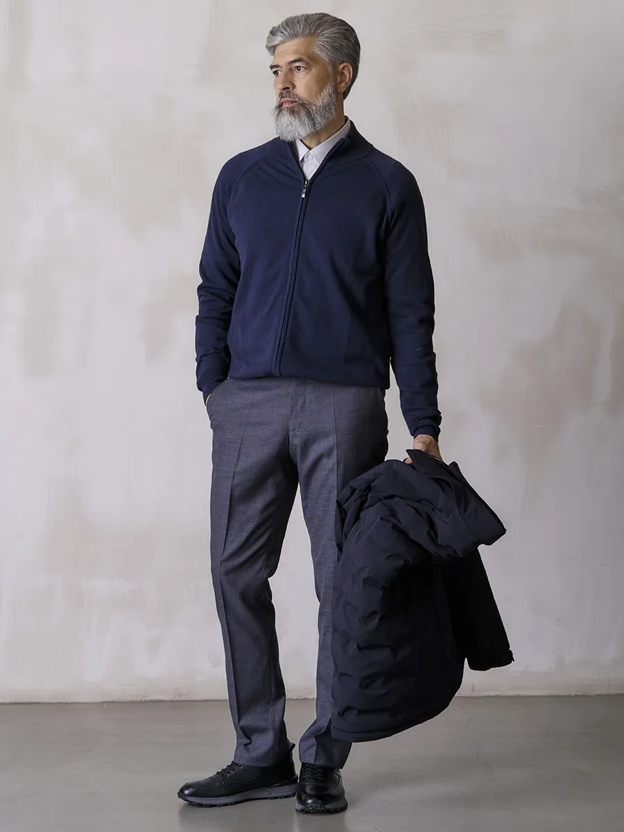 Мужской кардиган насыщенного темно-синего оттенка – воплощение практичности и стиля. Изготовленный из 100% хлопка, он дарит ощущение мягкости и комфорта в течение всего дня. Рукав реглан обеспечивает свободу движений, а нарочито грубые наружные швы добавляют образу нотку брутальности и индивидуальности. Воротник-стойка завершает лаконичный дизайн, делая этот кардиган идеальным выбором для создания расслабленных, но элегантных образов.