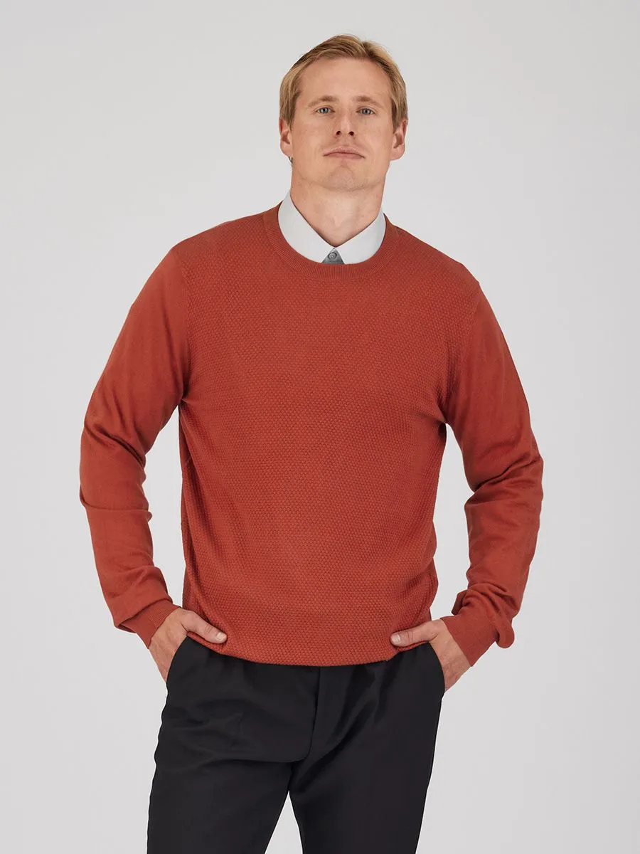 Мужской джемпер насыщенного красного цвета - это стильный и практичный выбор для прохладной погоды. Изготовленный из смесовой ткани, включающей полиэстер, нейлон, акрил и небольшое количество шерсти, он сочетает в себе комфорт, долговечность и простоту в уходе. Мелкий жаккардовый узор по переду добавляет изысканности и делает этот джемпер отличным дополнением к любому гардеробу.