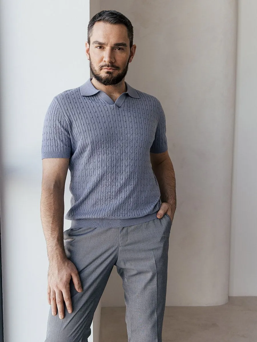 Мужская сиреневая рубашка с коротким рукавом, выполнена из качественного материала, в состав которого входят хлопок и акрил.Уникальности модели добавляет жаккардовый рисунок в виде косичек. Этот декоративный элемент придает трикотажной рубашке необычайный шик и добавляет оригинальности всему изделию. А воротник в стиле «поло», без излишних застежек и пуговиц, помогает создавать элагантные и стильные образы.