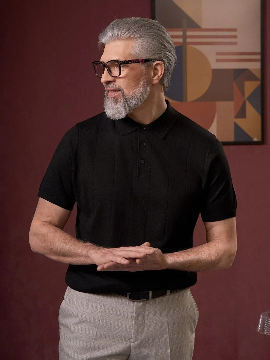Мужская трикотажная рубашка в классическом чёрном цвете. Её украшает геометричный узор из вертикальных полос одинаковой ширины, созданный по переду, что добавляет модели структурную строгость и визуальный ритм. Состав из вискозы, акрила и шерсти обеспечивает материи мягкость, комфорт и благородную натуральную теплоту. Эта рубашка станет универсальным элементом гардероба, подходящим для создания как сдержанных повседневных, так и более элегантных образов.