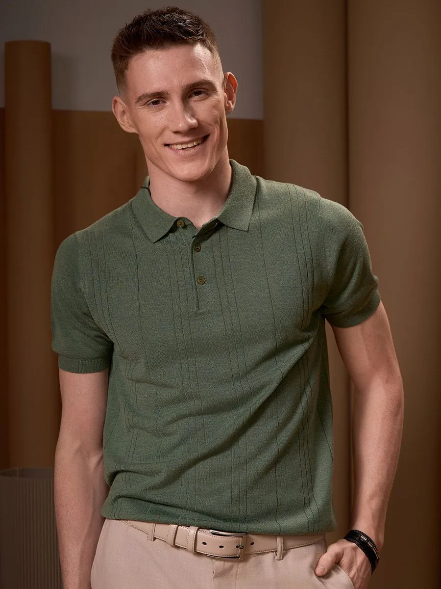 Мужская трикотажная рубашка насыщенного зелёного цвета. Её отличает динамичный рисунок из вертикальных полос разной ширины, созданный по переду, что придает модели современный ритмичный акцент. Мягкое и приятное на ощупь полотно из вискозы, акрила и шерсти обеспечивает комфорт, хорошую воздухопроницаемость и сохраняет аккуратный вид в течение дня. Этот предмет гардероба станет яркой, но сбалансированной основой для стильных повседневных образов.