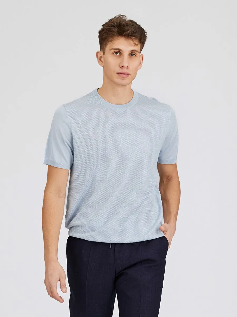 Мужская трикотажная рубашка голубого цвета с рельефным жаккардовым узором «соты» по переду. Комфортная ткань из вискозы, акрила и шерсти обеспечивает приятные тактильные ощущения и удобство в носке. Стильный фактурный рисунок делает модель визуально интересной, добавляя образу индивидуальности. Универсальная вещь для создания актуальных повседневных комплектов.