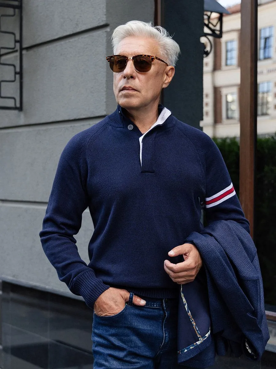 Свитер из 100% хлопка станет отличным дополнением и утеплением образа в стиле Casual. Самым ярким и привлекающим внимание элементом являются горизонтальные полосы на левом рукаве. Полосы освежают образ делают его более современным, к тому же хорошо сочетаются с декоративной белой отделкой планки воротника. Воротник-стойка застегивается на пуговицы, можно регулировать его открытость. Необычный образ получится в сочетании с пиджаком в стиле Casual.