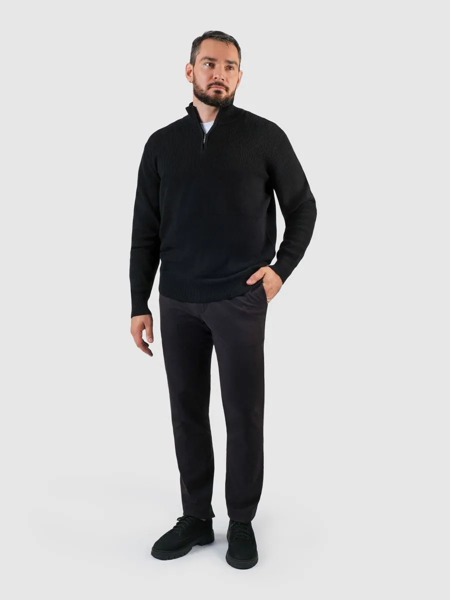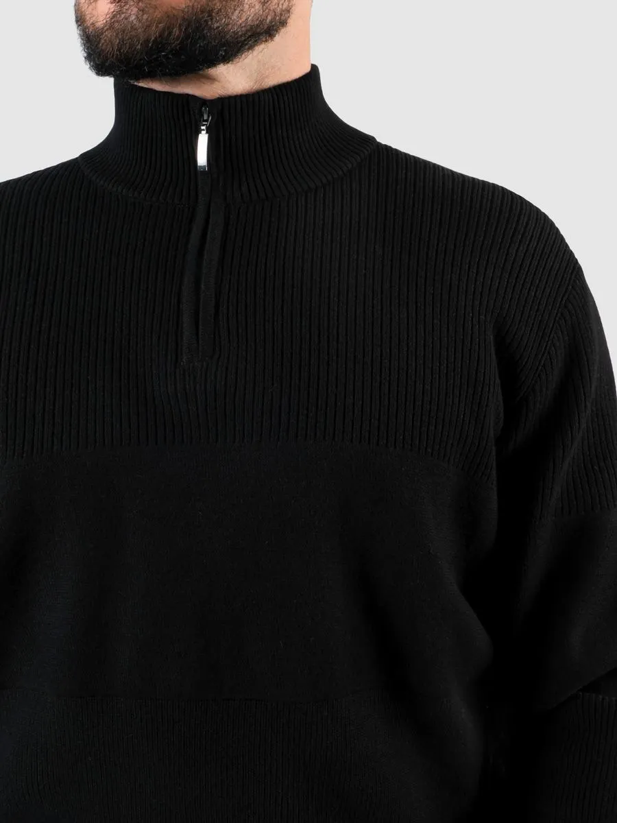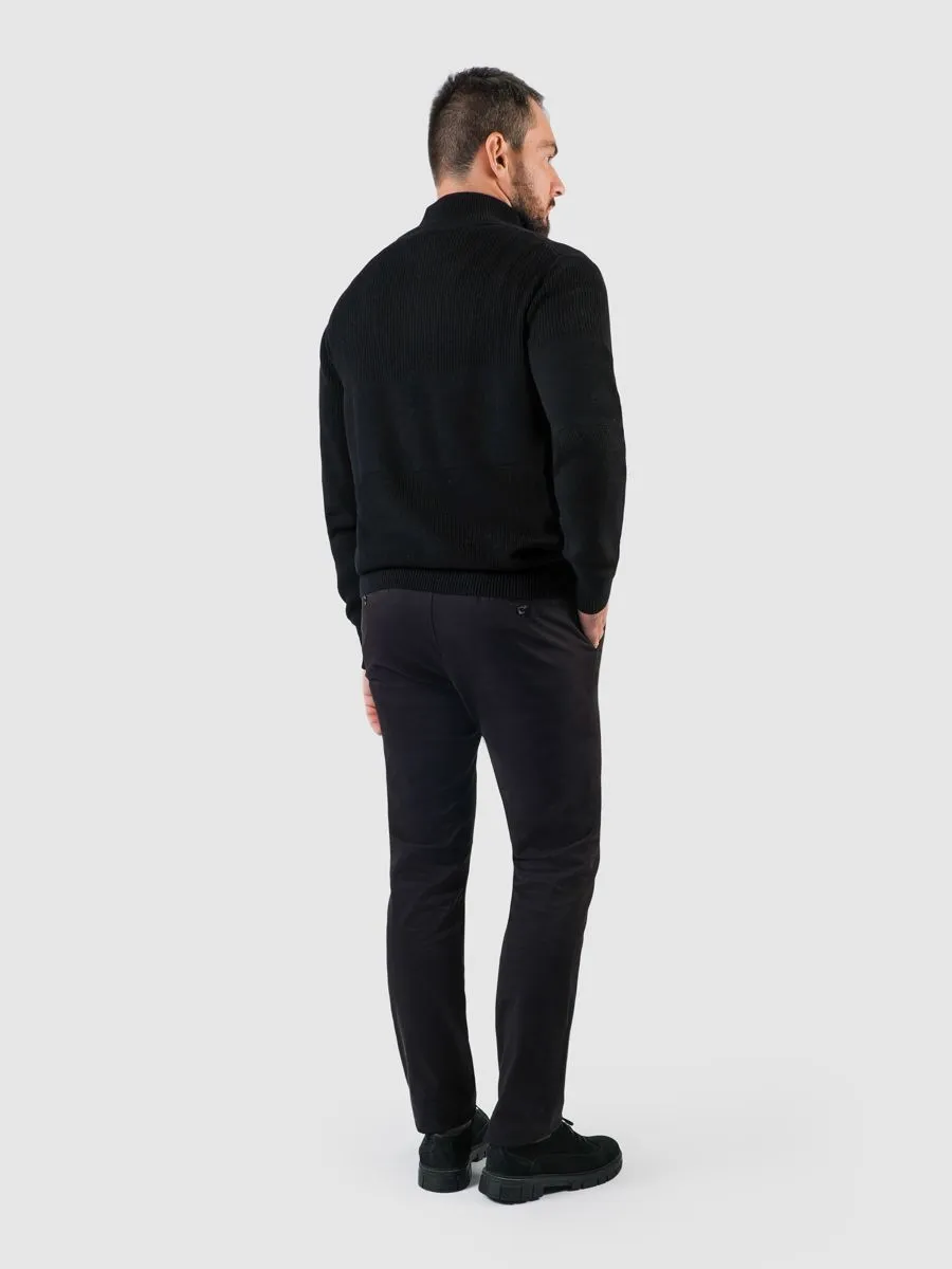 Мужской свитер с воротником стойкой и застежкой на молнию. Представлен в черном цвете и выполнен различными видами вязки по всему изделию. Текстурированная взяка на рукавах и спине придает оригинальность изделию. Отличный выбор для повседневной носки в холодное время года.