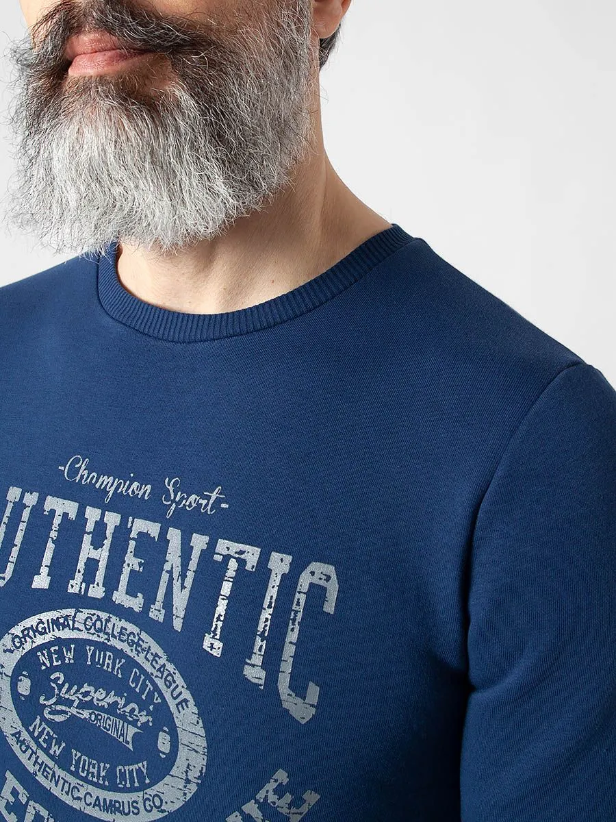 Свитшот крепко обосновался в гардеробе многих современных мужчин. Данный вид одежды полезен в активной жизни мужчины: спорт, отдых на природе и прочие развлечения. Полуспортивным свитшот украшен принтом с текстом "Аутентичная лига колледжей". По низу, вороту и на концах рукавов расположены удобные резинки, слегка прилегающие к телу. В составе содержится высокий процент содержания хлопка с добавлением полиэстера.