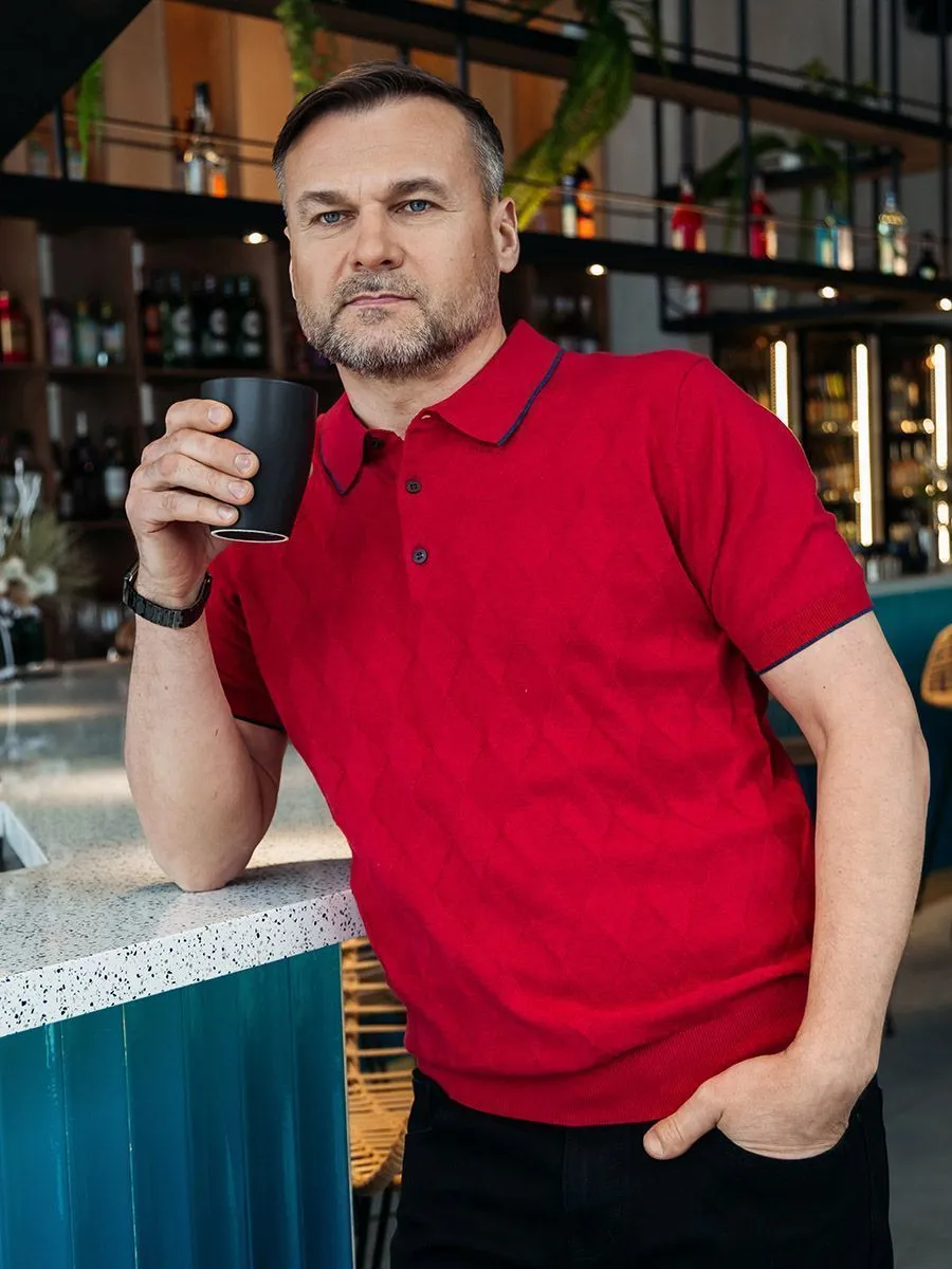 Яркое красное поло изготовлено из тонкой хлопковой пряжи, благодаря чему поло получилось очень легким и мягким. Спереди есть объемный рисунок, который был получен способом вязки. Воротник и рукава имеют декоративную трикотажную резинку с контрастной синей окантовкой. По низу изделия также проходит мягкая эластичная резинка. Поло будет особенно хорошо сочетаться с синими брюками и темными джинсами.