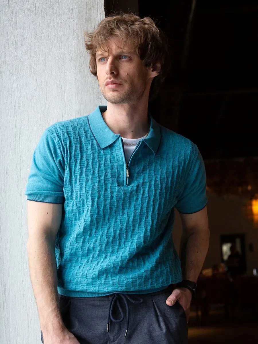 Разнообразие цветов и узоров важная составляющая стильного гардероба. Бирюзовая рубашка-поло поможет создать свежий летний образ. Оттенок хорошо сочетается с белым и черным цветами, а также денимом. Стоит отметить, что отложной воротник поло застегивается на молнию и имеет контрастную темно-синюю окантовку, такую же отделку имеют и рукава. Поло не только выглядит освежающе, но и чувствуется на теле мягко и легко, благодаря тонкой вязке. Поэтому можно поэкспериментировать и надеть под поло белую базовую футболку.