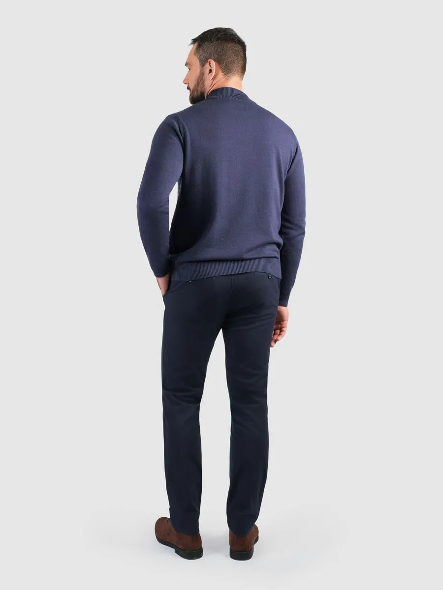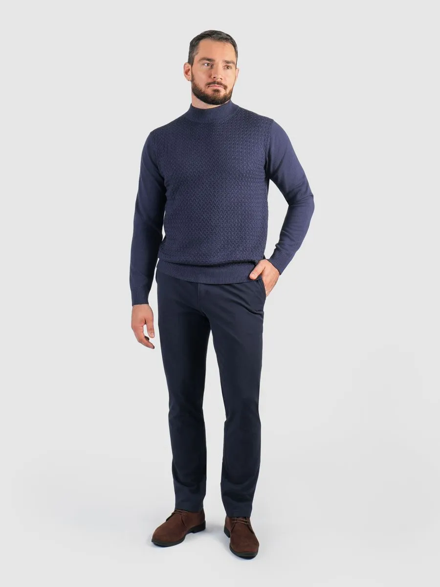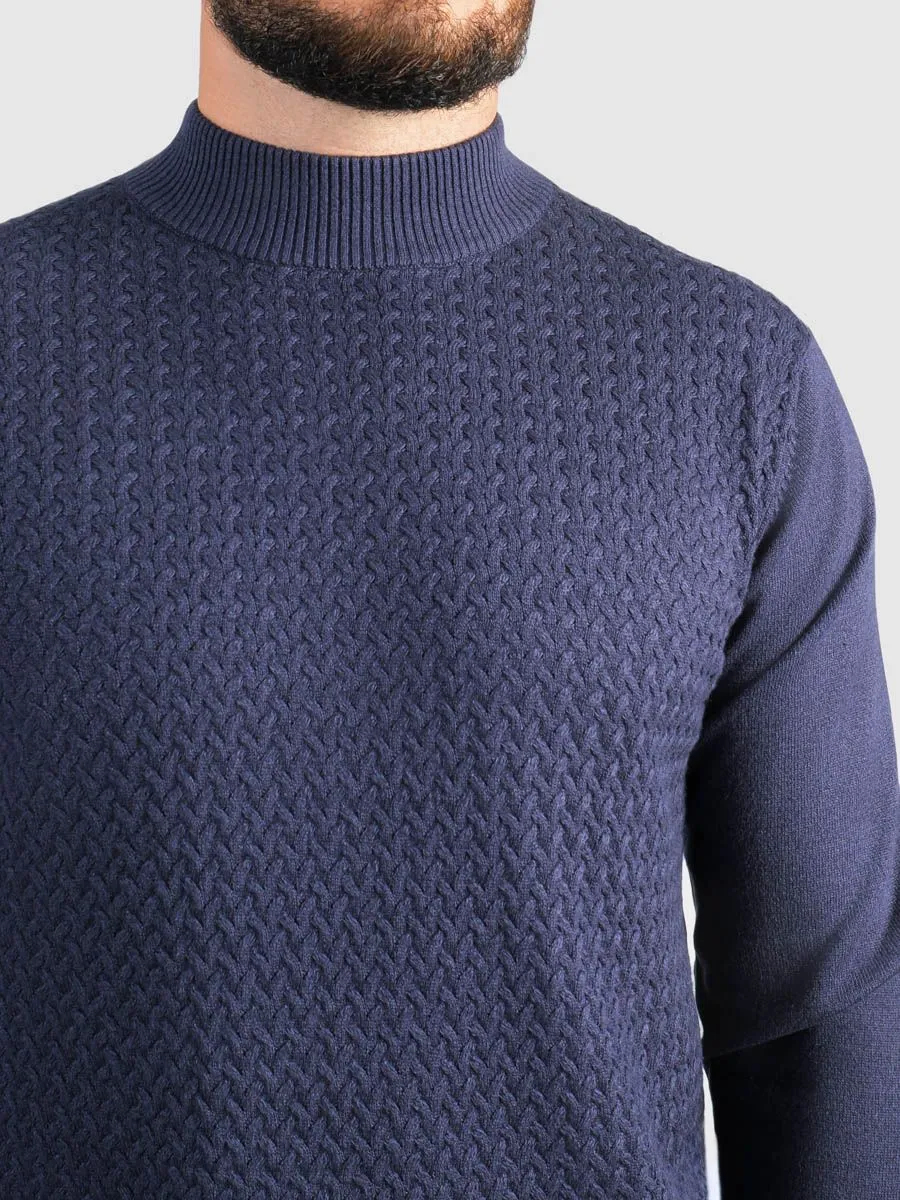 Эта водолазка – идеальный выбор для того, кто ценит сочетание комфорта и стиля. Темно-синий цвет придает изделию утонченность и элегантность, делая его подходящим как для офисных будней, так и для неформальных встреч. Короткий воротник создаёт современный силуэт, который прекрасно сочетается с любым типом одежды - от джинсов до классических брюк.Жаккардовый узор из мелких косичек на передней части изделия добавляет текстурный интерес и уникальность, ведь такой рисунок требует мастерства и тонкости в исполнении. Эта деталь привлекает внимание и создает эффект ручной работы, подчеркивая высокий уровень качества и заботу о каждой детали.Благодаря составу из 50% хлопка и 50% акрила, водолазка обеспечивает отличную теплоту и долговечность, оставаясь при этом мягкой и приятной на ощупь. Хлопок позволяет коже дышать, защищая от перегрева, в то время как акрил добавляет изделию прочности и устойчивости к износу. Такое сочетание материалов обеспечивает простоту в уходе и минимальное образование складок, что делает водолазку удобной для повседневного носки.