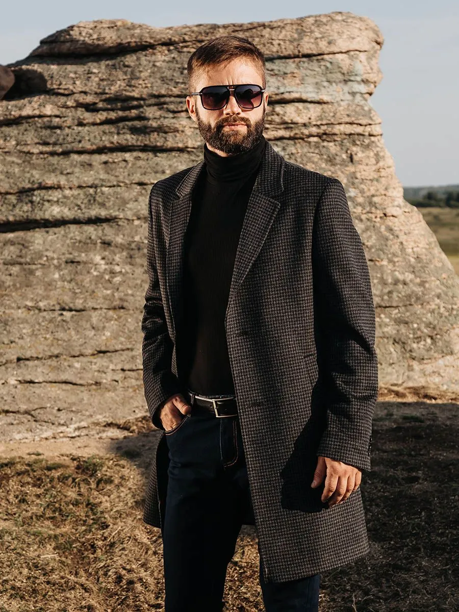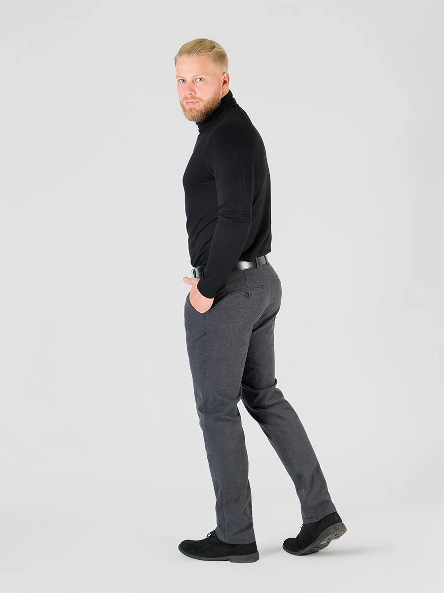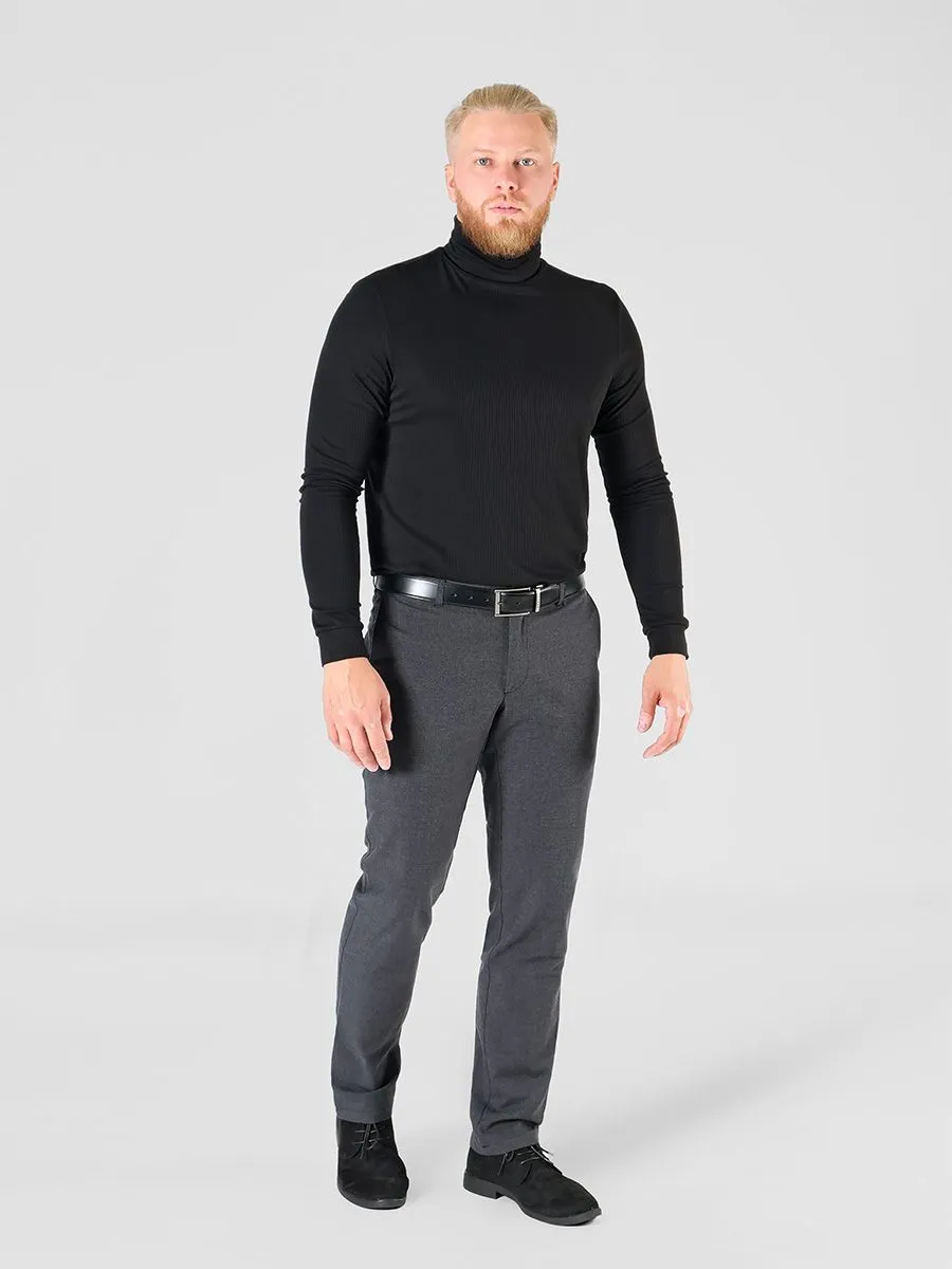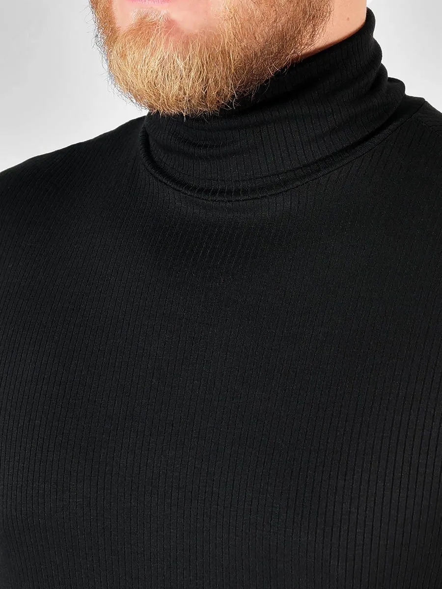 Мягкая черная водолазка может стать стильной основой мужского гардероба в демисезон. Водолазка имеет фактуру в виде очень мелкой вертикальной полоски. Воротник водолазки подгибной и хорошо тянется, поэтому не будет передавливать горло. Силуэт водолазки прямой, ее можно заправлять в брюки или носить навыпуск.