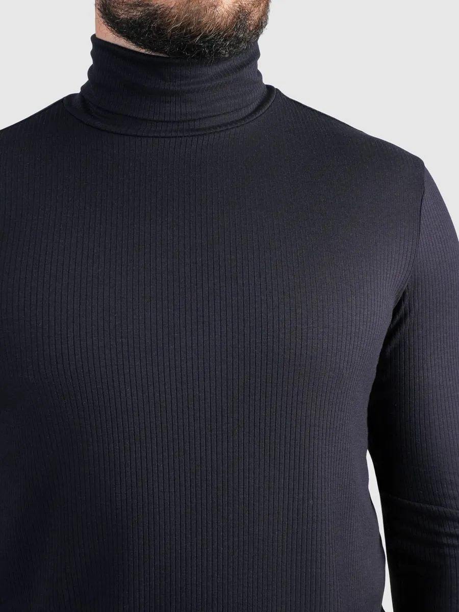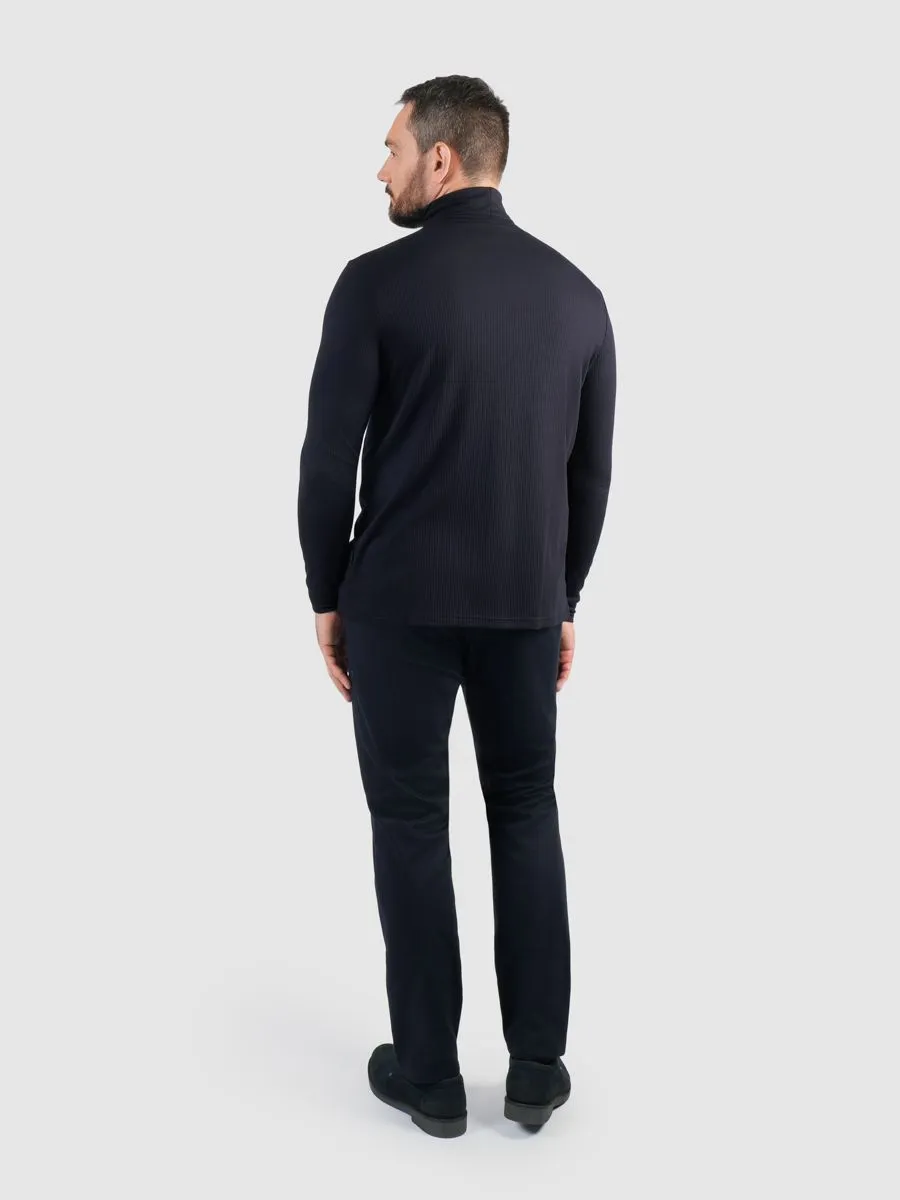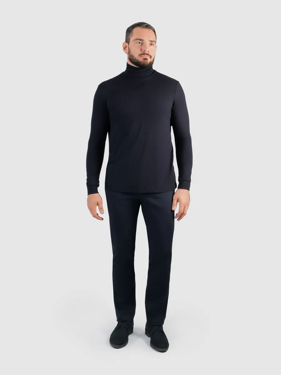 Темно-синяя мужская водолазка — это воплощение элегантности и комфорта в одном изделии. Состав материала, включающий 95% вискозы и 5% эластана (ПУ), обеспечивает превосходную посадку и мягкость. Высокий ворот стойка придает модели благородный и стильный вид, подчеркивая изящность шеи. Эта водолазка отлично сочетается как с классическими брюками, так и с джинсами, создавая как деловые, так и повседневные образы. Незаменимая деталь гардероба, которая позволит чувствовать уверенность и комфорт в любой ситуации.