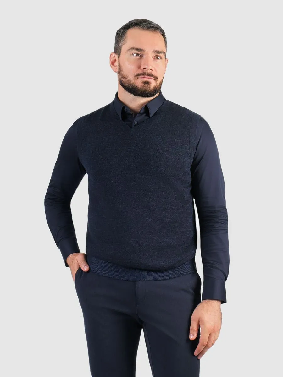 Этот жилет идеально подходит для холодных дней, когда комфорт и стиль необходимы. Он связан из пряжи двух цветов, благодаря чему цвета лицевой и изнаночной сторон разные, что придает изделию особый шарм и уникальность. Тёмно-синий оттенок жилета легко сочетается как с повседневной, так и с деловой одеждой, предоставляя вам свободу выбора в любых ситуациях. Мягкая и приятная на ощупь ткань, состоящая из половины натуральной шерсти и половины акрила, обеспечивает оптимальное тепло и долговечность.