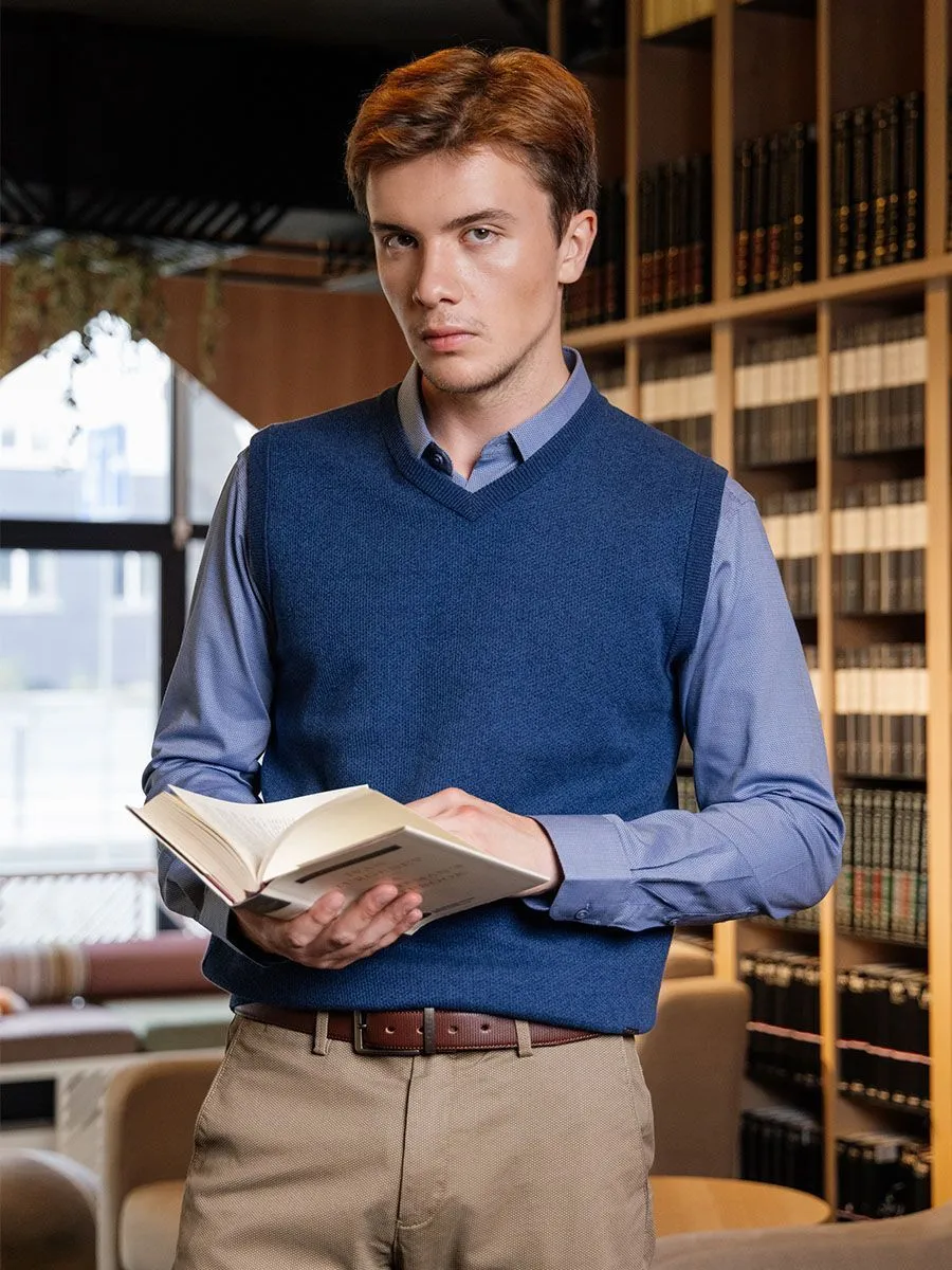 Мужской синий трикотажный жилет - это стильная и функциональная одежда для мужчин. Жилет изготовлен из мягкого и теплого трикотажного материала, который обеспечивает комфорт и защиту от холода. Брюки: P2406
