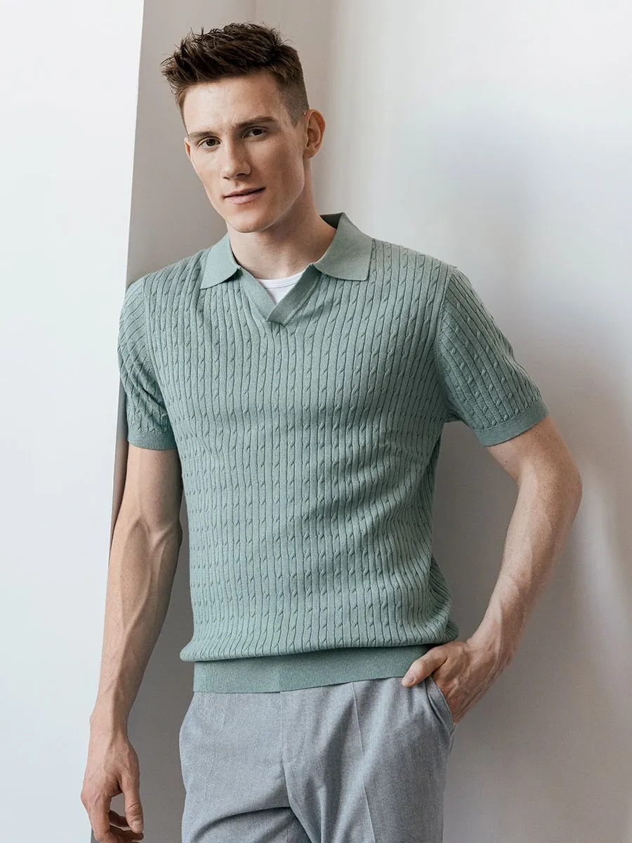 Мужская рубашка зеленого оттенка из качественного трикотажного материала с тонкой вязкой. Особенностью этой модели является рисунок жаккард в виде косичек, он придает оригинальности изделию. Воротник в стиле «поло» без застежки создает особый шик и изысканность этой модели.