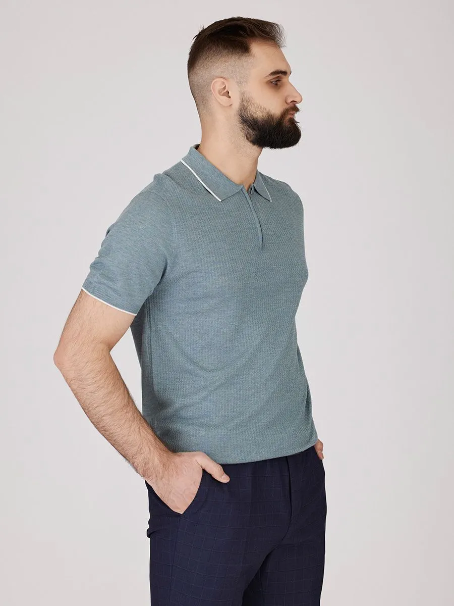 Трикотажная рубашка серо-голубого оттенка выполнена с отложным воротником на удобной молнии. Комбинированная вязка мелким жаккардом на передней части создает тонкую текстуру, добавляя модели визуальную глубину и интерес. Состав из вискозы, акрила и небольшой доли шерсти обеспечивает комфортную мягкость, хорошую воздухопроницаемость и сохраняет форму. Эта модель предлагает практичный и стильный вариант для повседневной носки, сочетая лаконичный дизайн с вниманием к деталям.