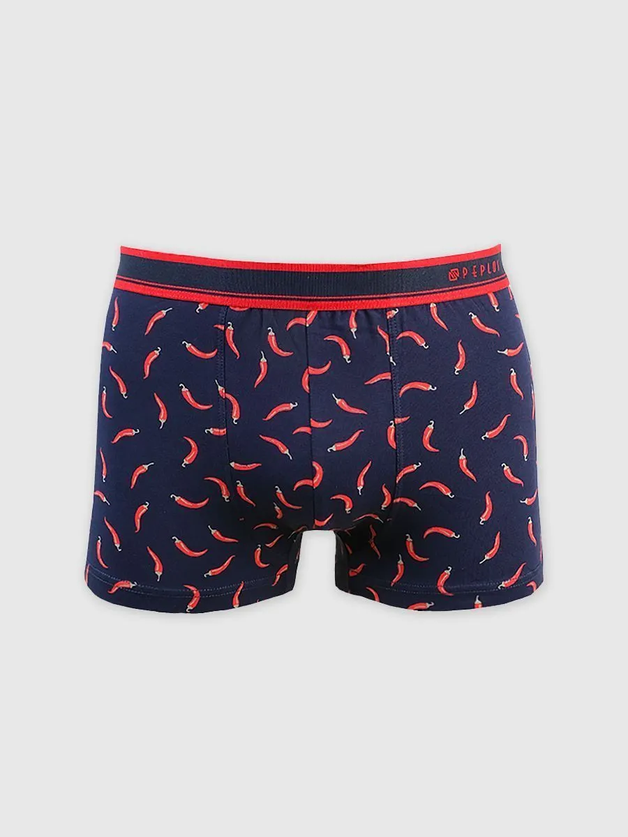 Трусы боксеры мужские Peplos UW23005-BX в темно-синем цвете с ярким принтом в виде острого красного перца — это идеальный выбор для мужчин, которые любят выделяться и ценят комфорт. Изготовленные из мягкого хлопка (95%) с добавлением спандекса (5%), они обеспечивают отличную посадку и свободу движений. Уникальный принт придаёт этим боксерам игривый и стильный вид, делая их отличным дополнением к повседневному гардеробу. Обновите свой стиль с трусами боксерами Peplos UW23005-BX и наслаждайтесь комфортом и оригинальностью в каждом дне!