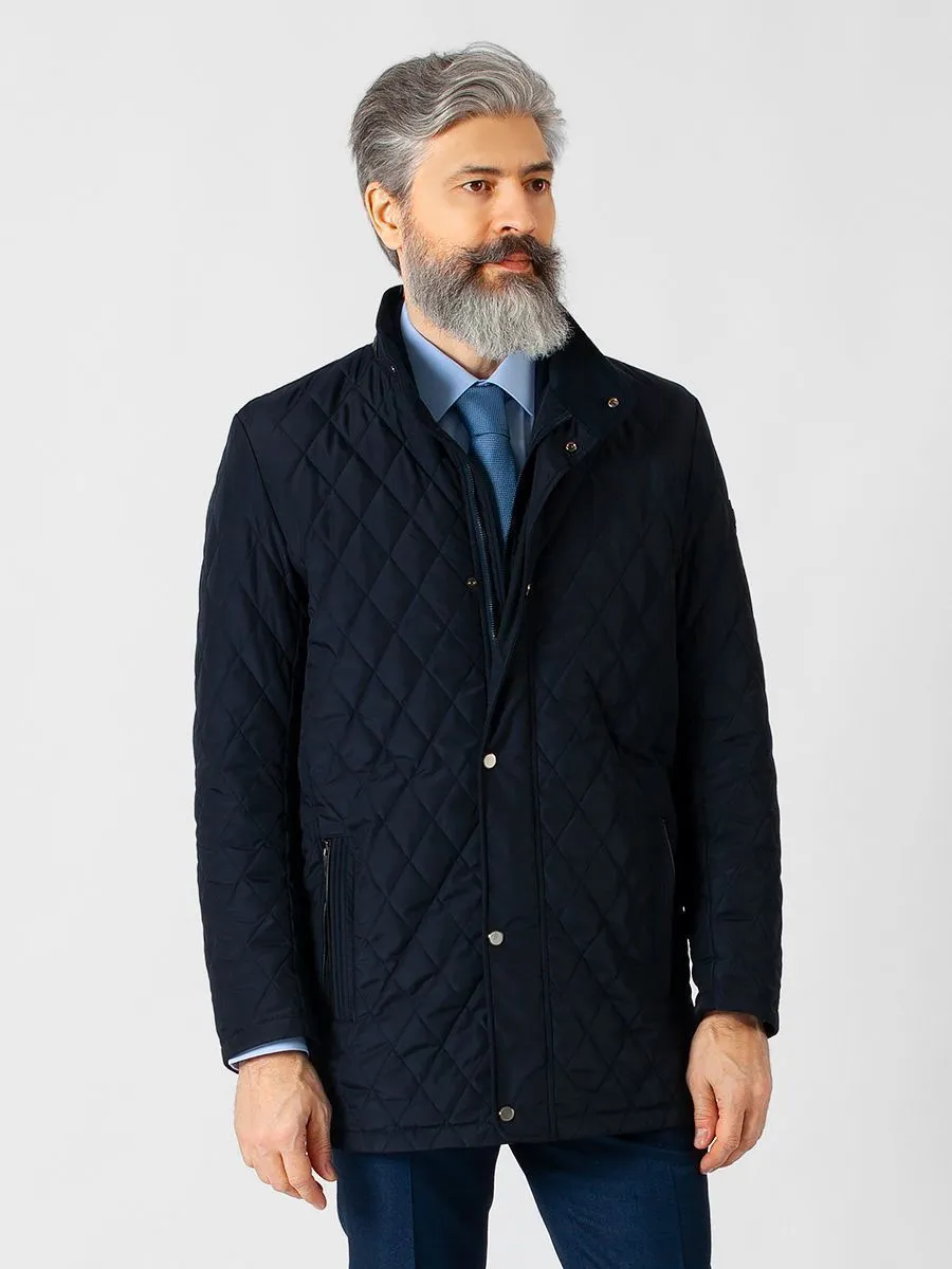 Универсальность стеганой легкой куртки OW2116-JA неоспорима. Эта модель на все времена! Практичная темно-синяя ткань, ромбовидная стежка, удобная длина, позволяющая одеть куртку с пиджаком – все это сделает эту вещь главной в гардеробе мужчины. Подобрать брюки не составит труда – подойдут как классические, так и модели в стиле кэжуал. Центральная застежка на молнию и планку с 6 металлическими кнопками. Внешние карманы двойные: на молнию и с листочкой с окантовкой из искусственной черной кожи. Стойка отделана деталью из черной искусственной кожи с внешней стороны, и синей искусственной замшей с внутренней стороны. Легкий утеплитель холофайбер весом 70 г. Подклад ярко-синего цвета.