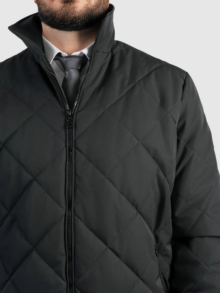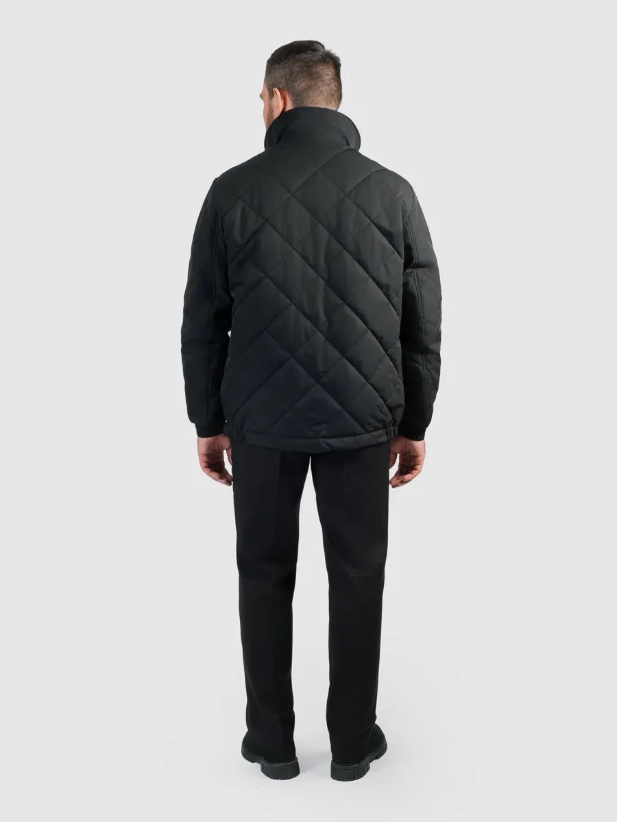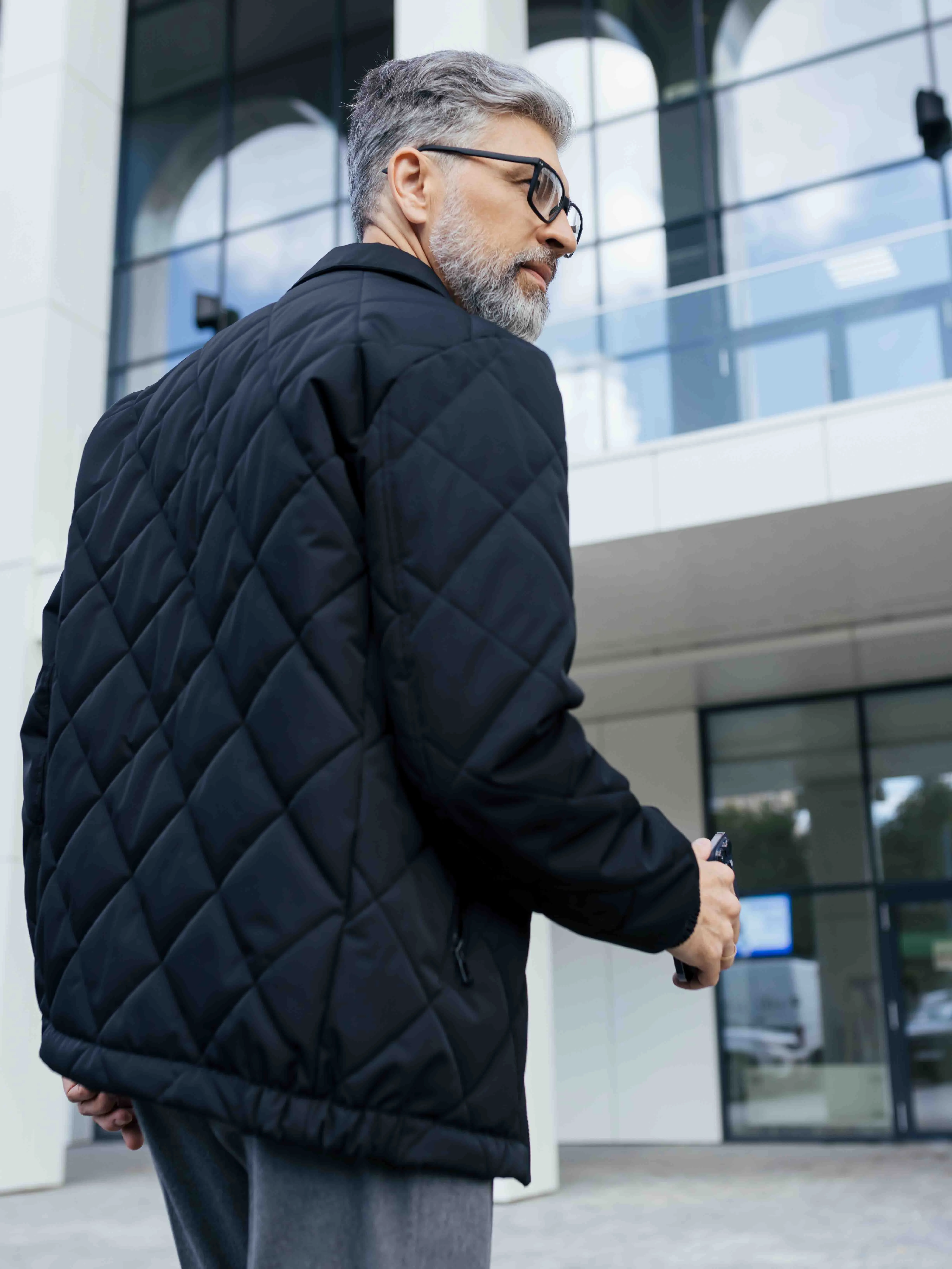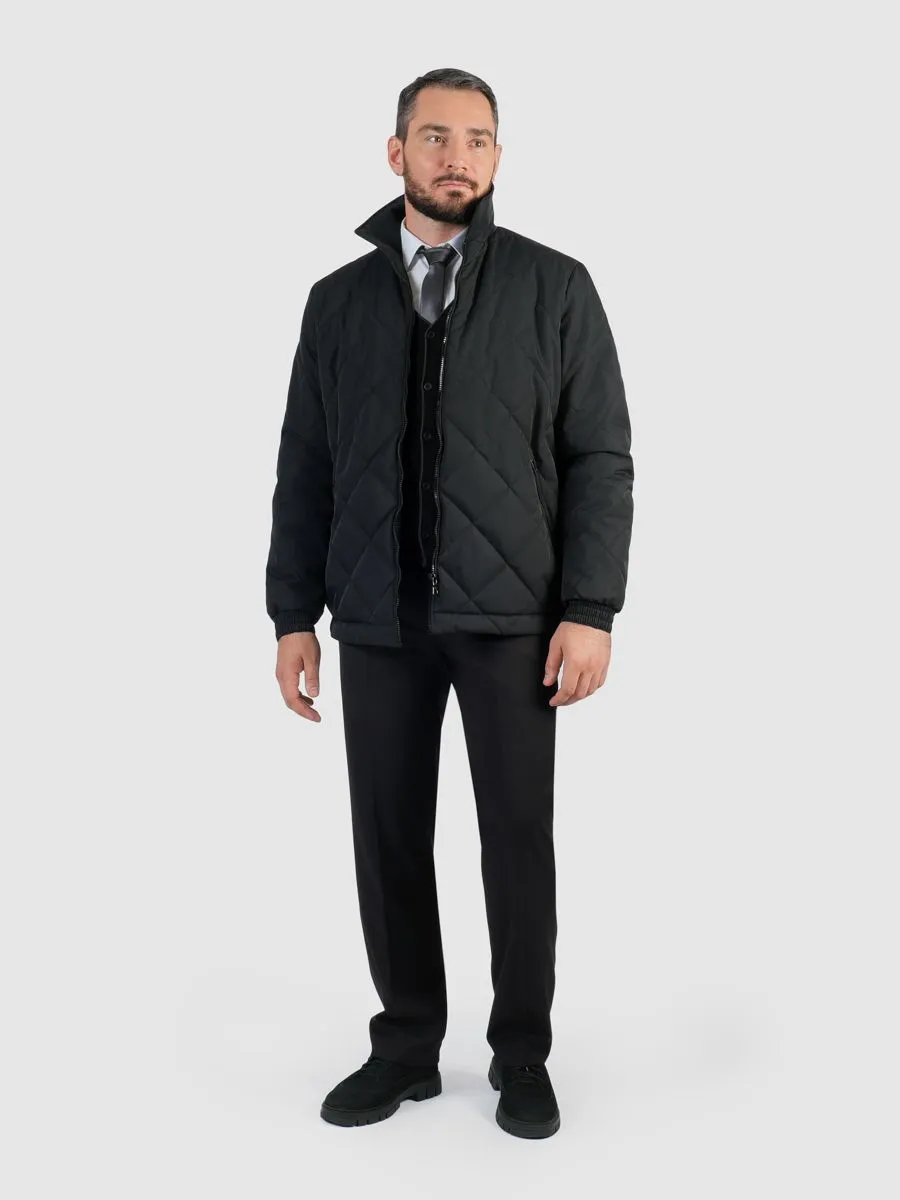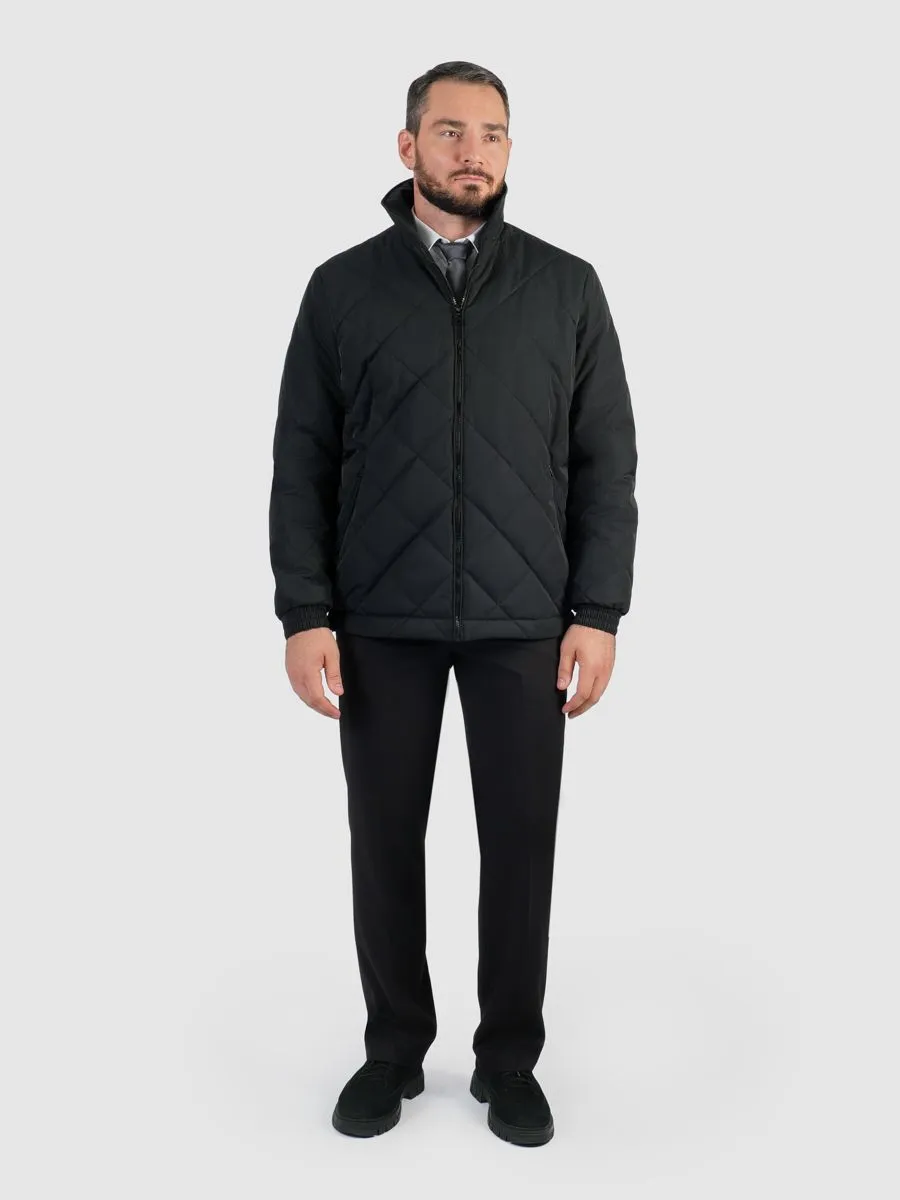 Черная мужская куртка с отложным воротником. Прямой силэт подходит для классических образов. Куртка утеплена холлофайбер-софт 150 гр./м2. Стежка в виде ромба добавляет изысканности образу, подчеркивая вкус и стиль своего обладателя.