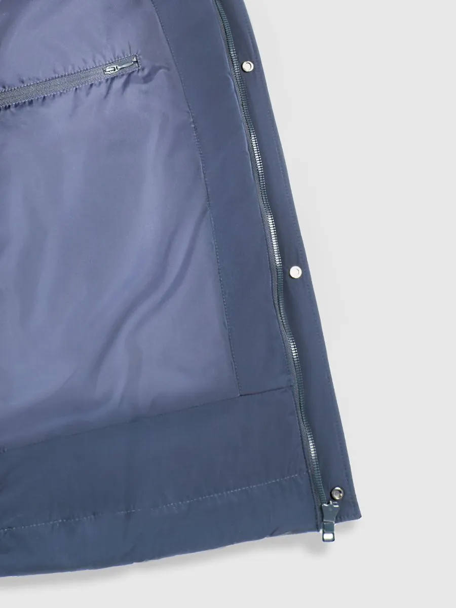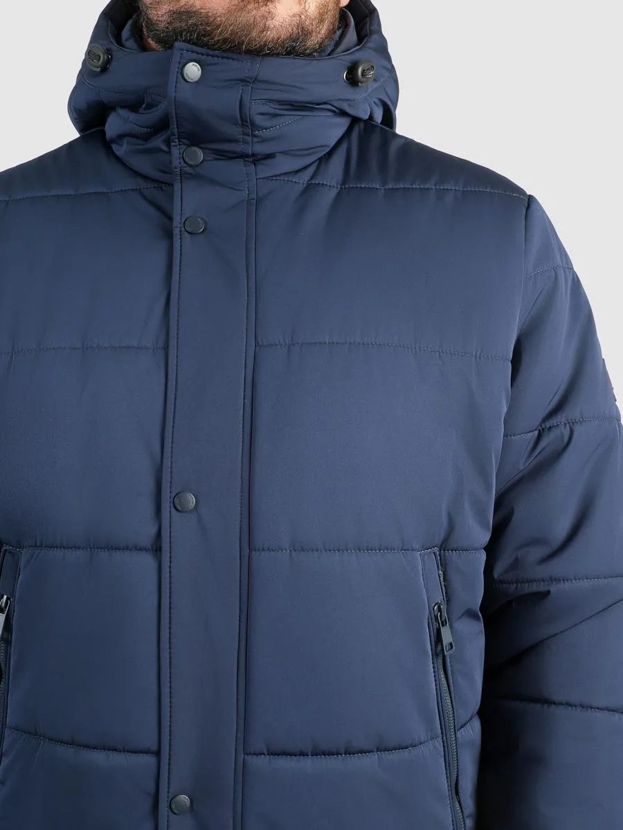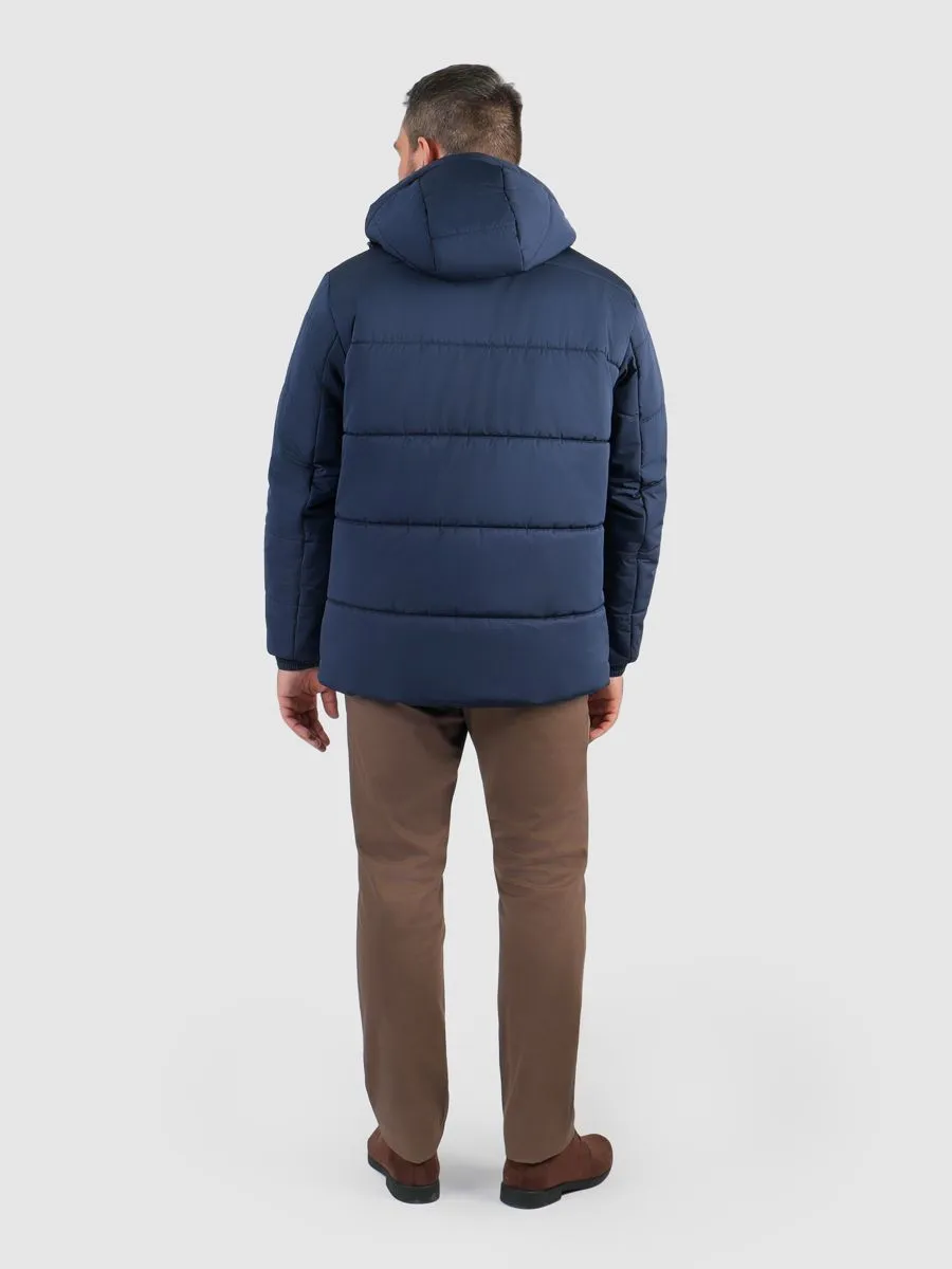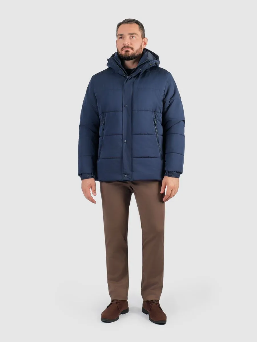 Синяя мужская куртка с капюшоном. Утеплена текстоном 200 гр. Застегивается куртка на застежку молнию и дополнительно на кнопки, что позволяет не пропускать холодный воздух. Два боковых кармана оснащены застежкой на молнии, сохраняя необходимые мелочи в безопасности. На манжетах имеется регулировка объема на кнопках, которая помогает подобрать комфортную плотность прилигания куртки к запястьям для удобства носки.