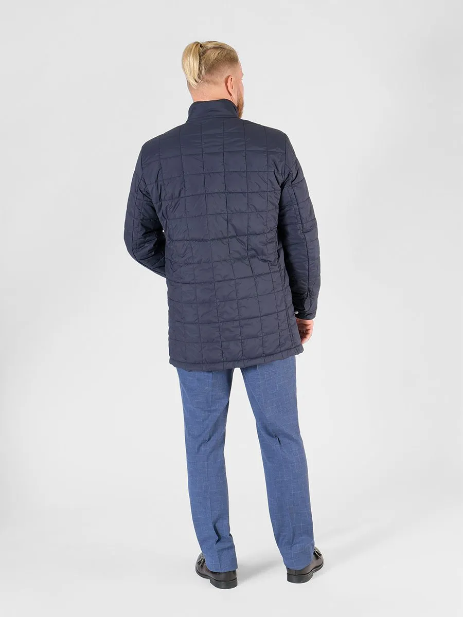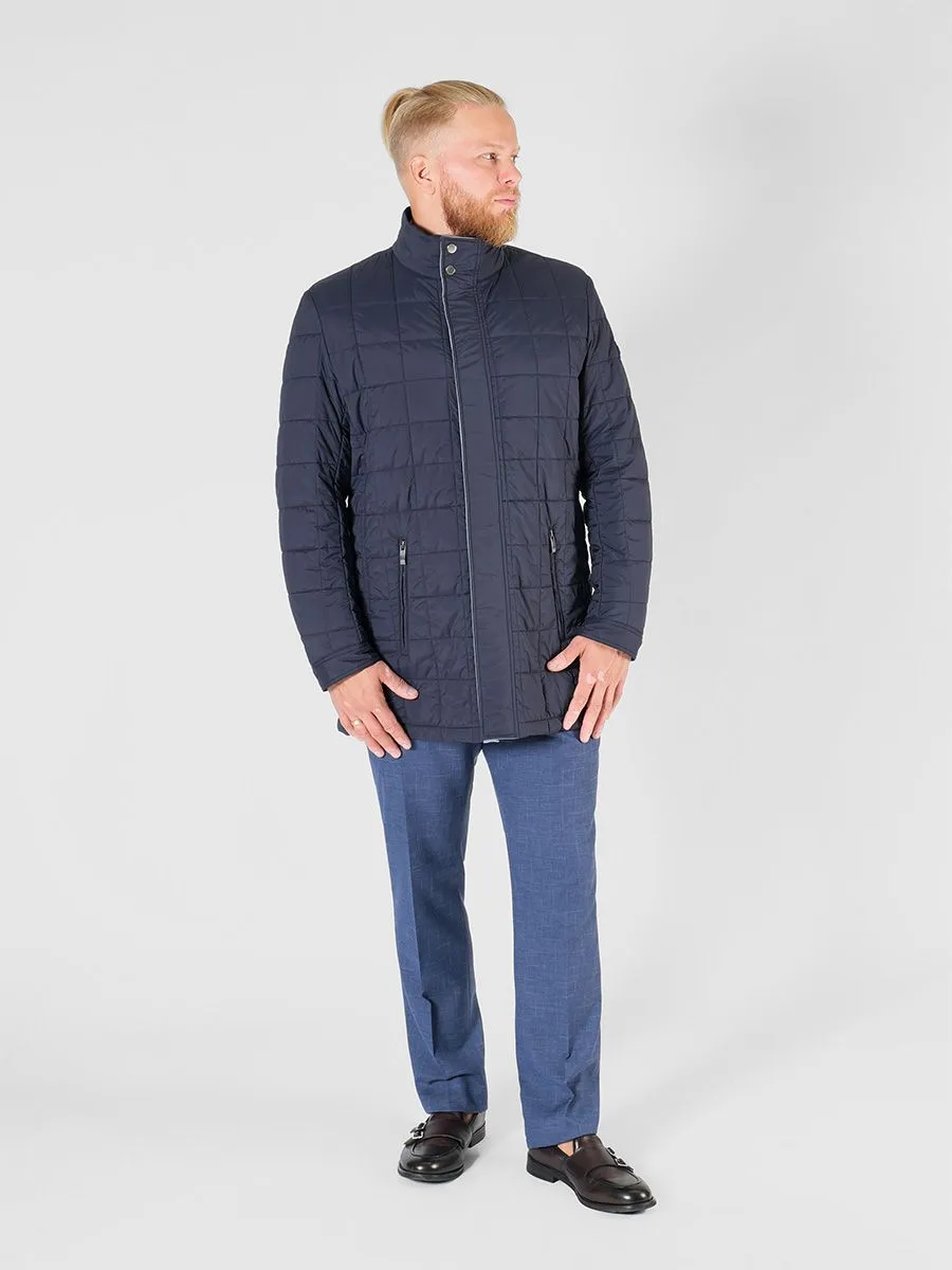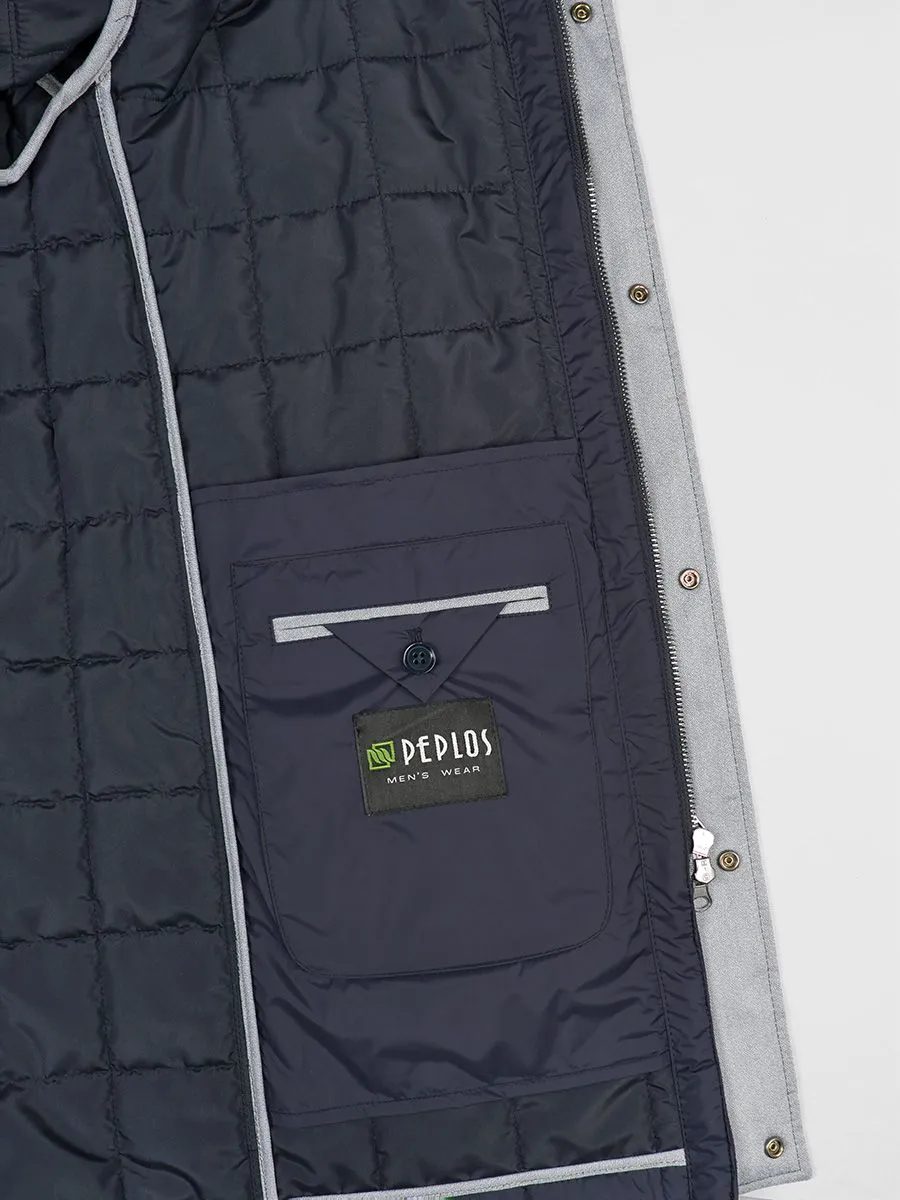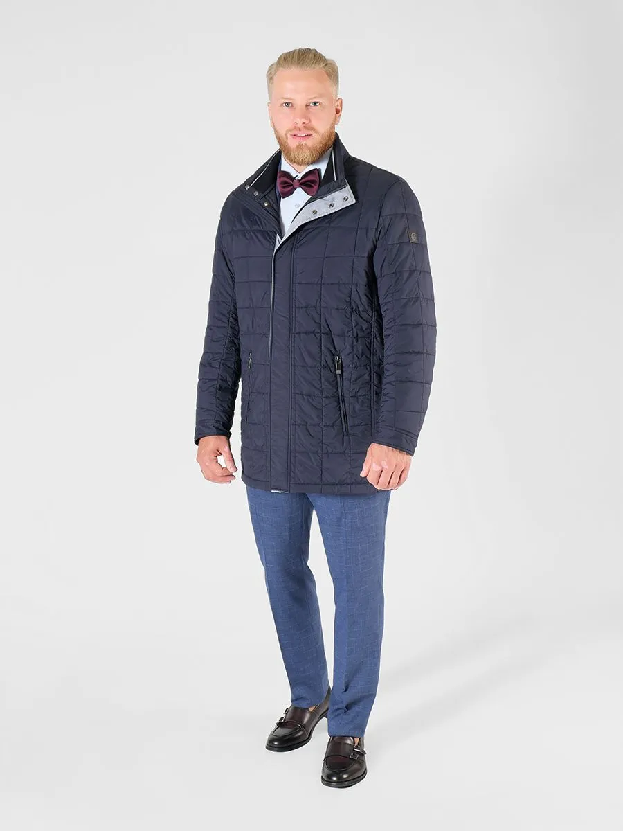 Стеганная мужская куртка от Peplos подойдет любителям классического стиля. Удлиненный силуэт хорошо подходит для носки поверх пиджака, к тому же поясница защищена более надежно. Застежка центрально-бортовая до верха застегивается на замок-молнию и шесть потайных кнопок на планке и две сквозные кнопки на стойке. Внутри у воротника есть отделка из трикотажного материала, что обеспечивает комфорт при носке. Воротник красиво смотрится в расстегнутом виде, за счет контрастной планки серого цвета. Низ рукавов с манжетами, которые регулируется с помощью паты и двух кнопок.