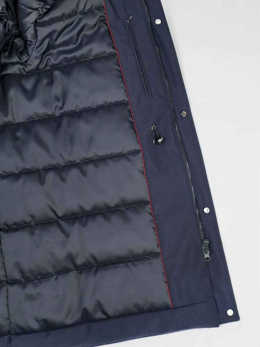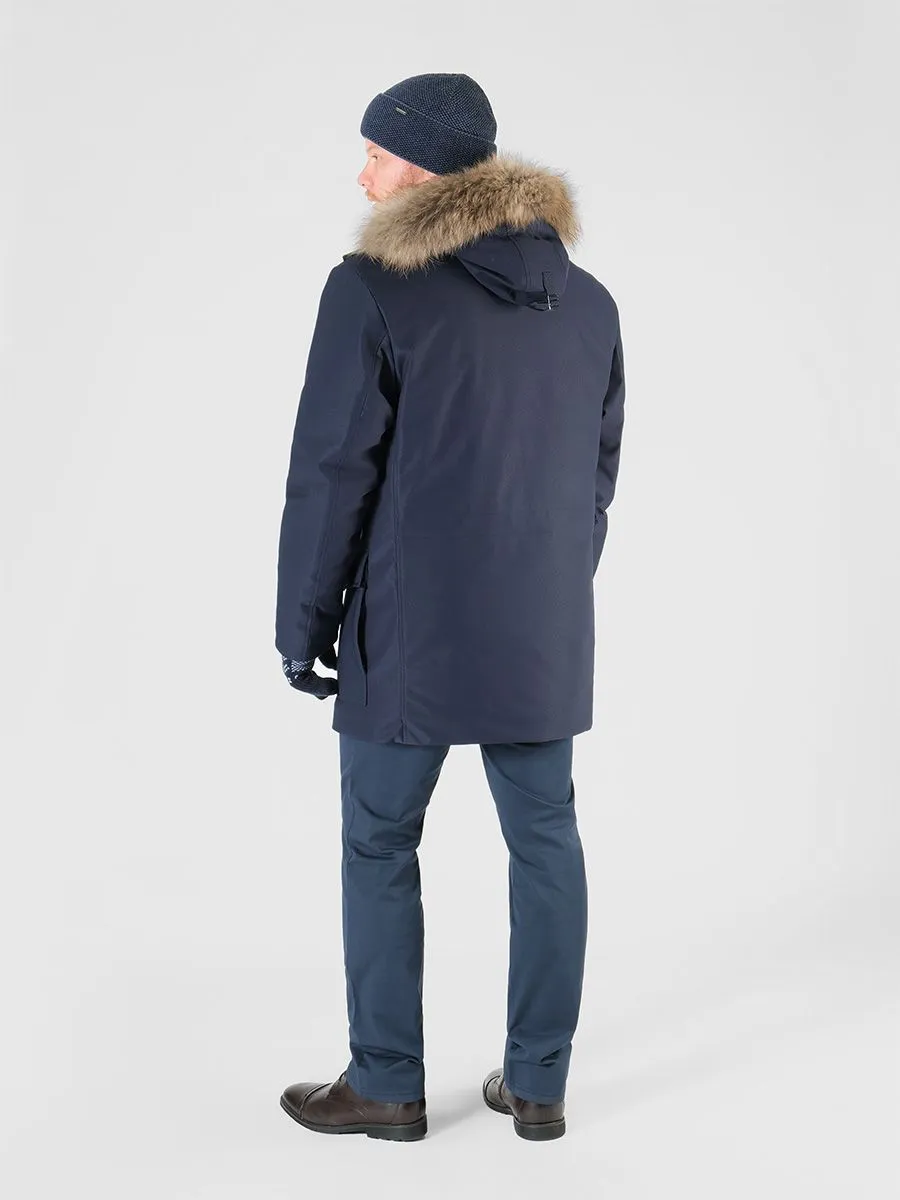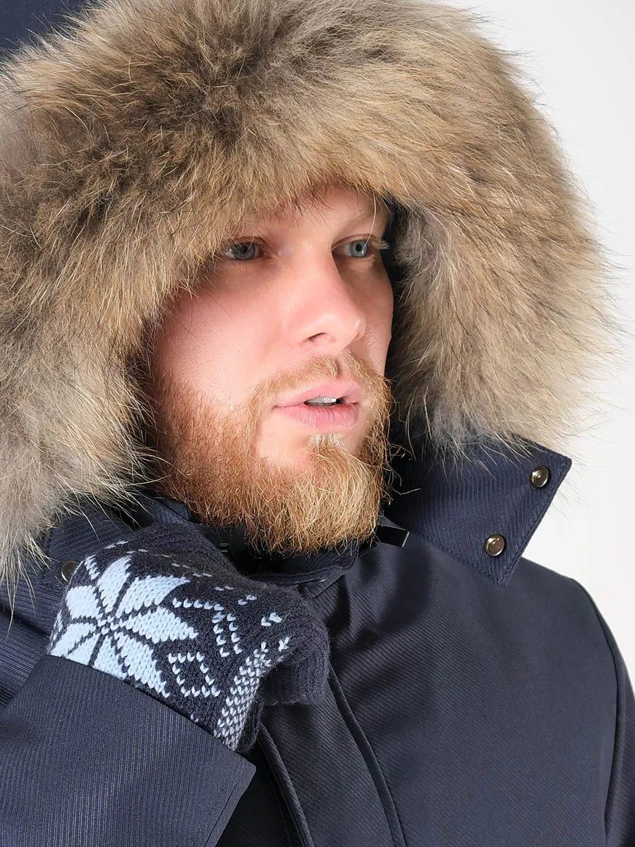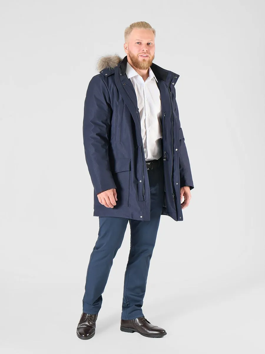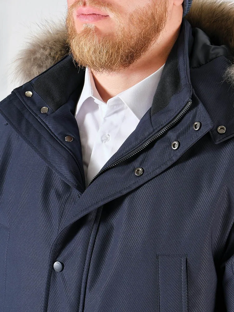 Стильная и теплая мужская куртка необходимый элемент мужского гардероба в холодное время года. Куртка имеет хорошую длину, что надежно защищает от продувания поясницы, к тому же под низ легко поместится пиджак. У куртки плотная верхняя ткань с ребристой фактурой, обладающая хорошей грязеустойчивостью и износостойкостью. Внутри куртки плотный утеплитель холлофайбер. Он легко стирается и быстро высыхает, не сваливаясь и сохраняя все свои свойства. Состоит из множества волокон, из-за чего в нем достаточно воздуха для удержания тепла. Материал мало подвержен износу и не вызывает аллергических реакций. Модель куртки предусматривает два верхних кармана на кнопках, два нижних накладных кармана, в которые встроены боковые карманы, а также два внутренних вертикальных кармана на замке-молнии. Горловина застегивается до самого верха, есть трикотажная внутренняя отделка для мягкости и комфорта. Капюшон отстежной на молнии с отделкой из натурального меха енота.