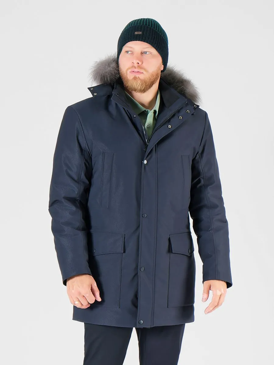 Стильная и теплая мужская куртка необходимый элемент мужского гардероба в холодное время года. Куртка имеет хорошую длину, что надежно защищает от продувания поясницы, к тому же под низ легко поместится пиджак. У куртки плотная верхняя ткань с ребристой фактурой, обладающая хорошей грязеустойчивостью и износостойкостью. Внутри куртки плотный утеплитель холлофайбер. Он легко стирается и быстро высыхает, не сваливаясь и сохраняя все свои свойства. Состоит из множества волокон, из-за чего в нем достаточно воздуха для удержания тепла. Материал мало подвержен износу и не вызывает аллергических реакций. Модель куртки предусматривает два верхних кармана на кнопках, два нижних накладных кармана, в которые встроены боковые карманы, а также два внутренних вертикальных кармана на замке-молнии. Горловина застегивается до самого верха, есть трикотажная внутренняя отделка для мягкости и комфорта. Капюшон отстежной на молнии с отделкой из натурального меха серебристой лисицы.