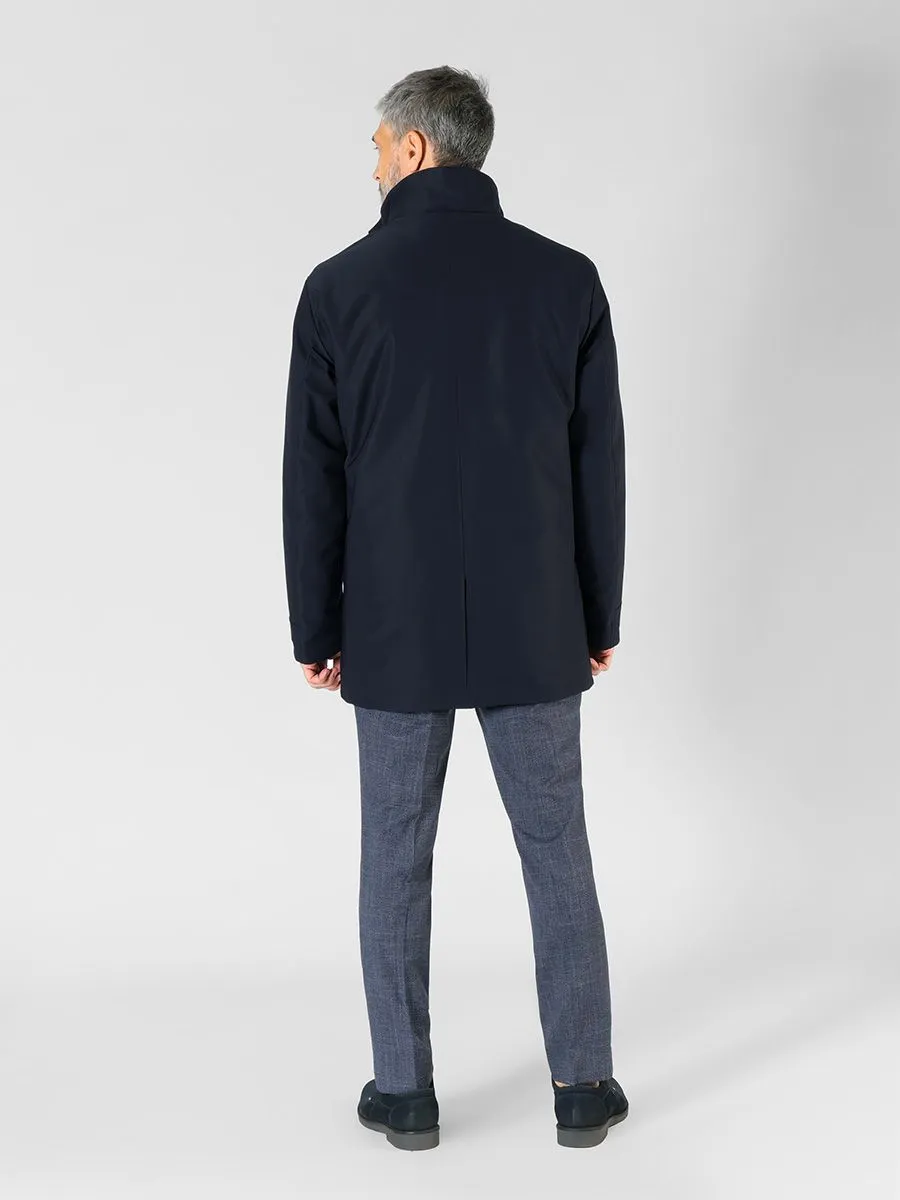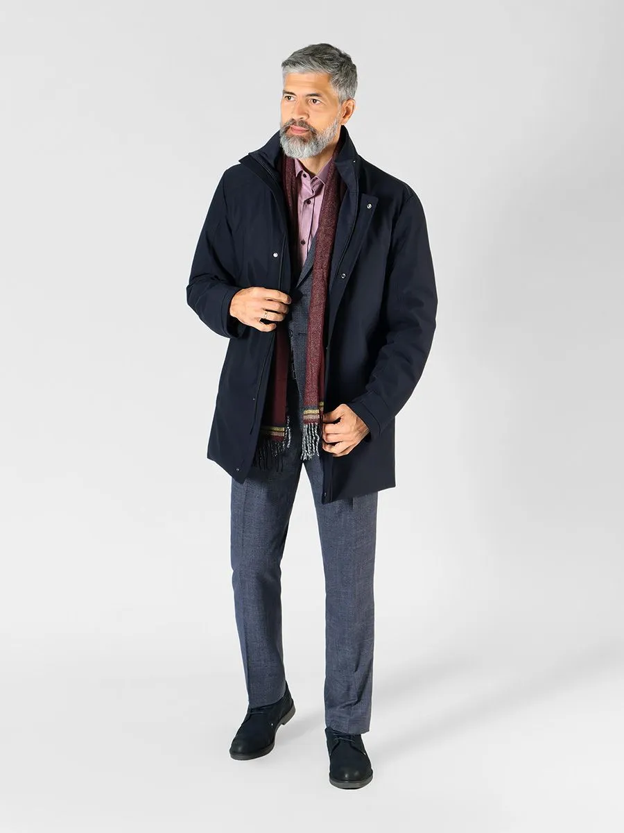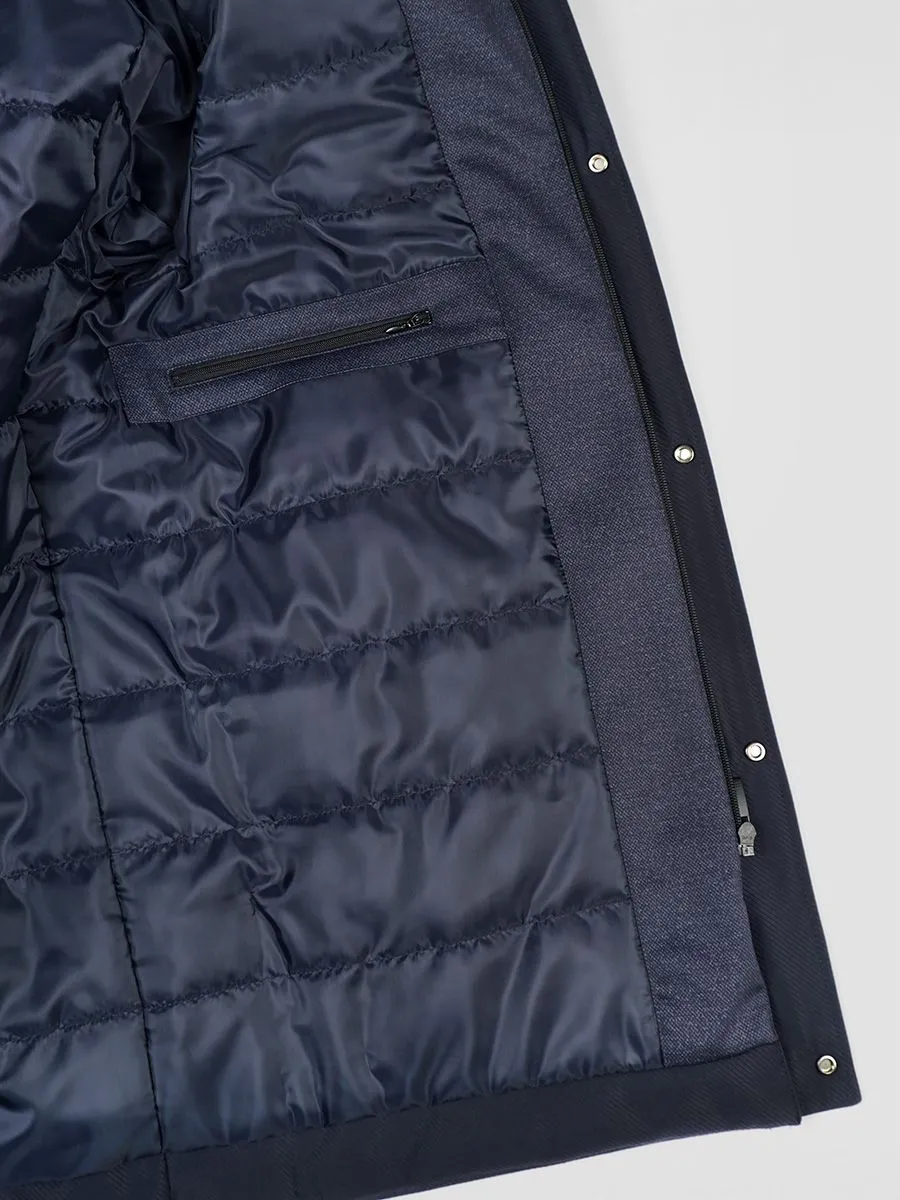 Куртка мужская от Peplos собрала в себе лучшие характеристики различных моделей. Удлиненный силуэт позволяет носить пиджаки и защищает поясницу от продувания. Центральная застежка на молнию и кнопки перетекает в воротник-стойку с мягкой внутренней отделкой. Такой воротник надежно защищает горло от ветра, но также можно использовать шарф для создания более интересного образа. По бокам расположены двойные карманы, нижние застегиваются на молнию. Имеются внутренние карманы на молнии. Ткань верха имеет ребристую фактуру обладает хорошей износостойкостью и ветронепроницаемостью, утеплитель - 100% холлофайбер.