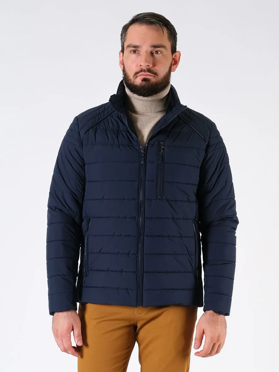 Мужская стеганая утепленная куртка представлена в синем и красном цвете. Горизонтальная стежка на переде и спинке, вертикальная сбоку. Кокетка с черным кантом из экокожи. Карманы с отделкой из экокожи. Матовая ткань. Два внутренних кармана