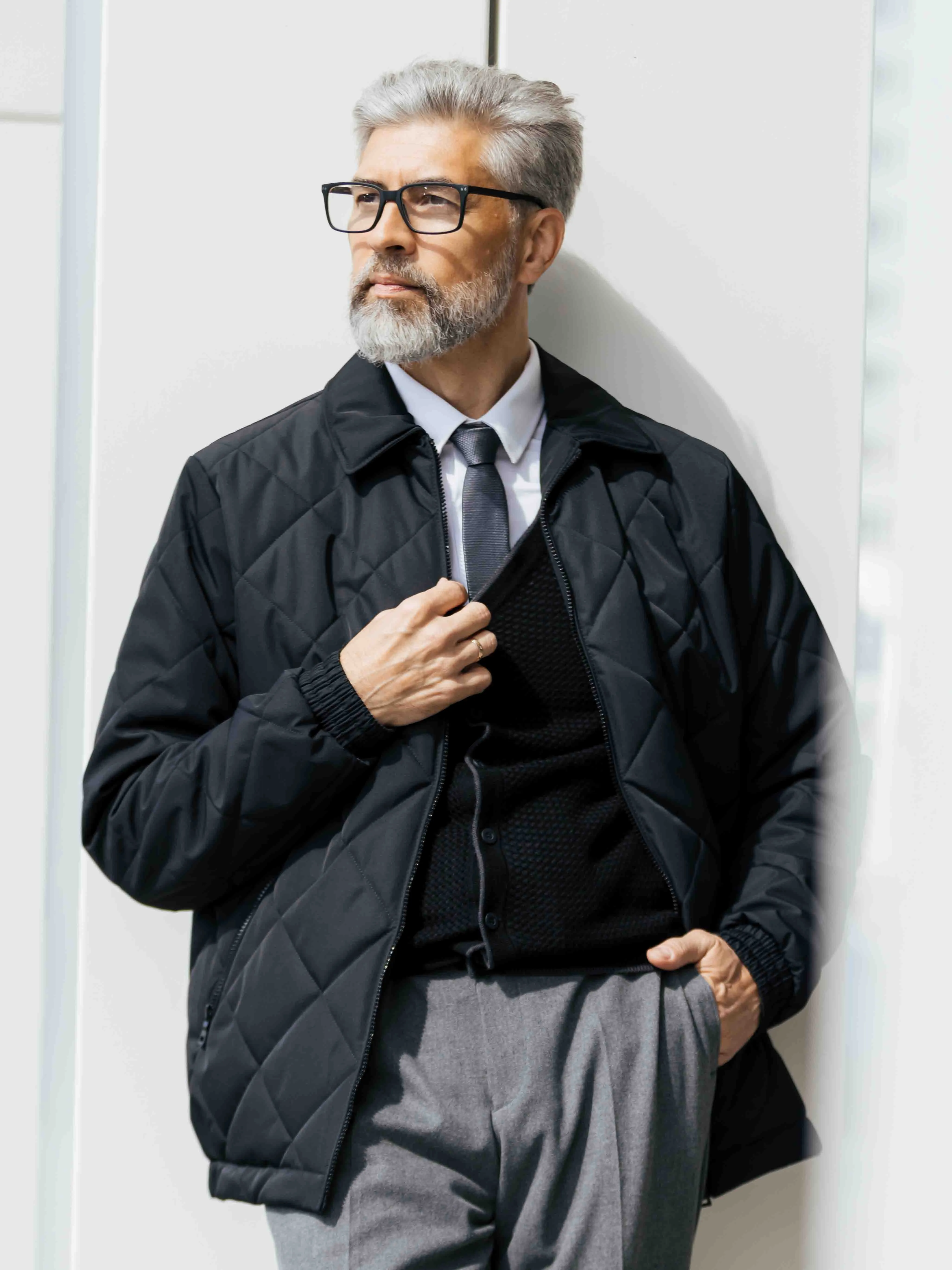 Черная мужская куртка с отложным воротником. Прямой силэт подходит для классических образов. Куртка утеплена холлофайбер-софт 150 гр./м2. Стежка в виде ромба добавляет изысканности образу, подчеркивая вкус и стиль своего обладателя.