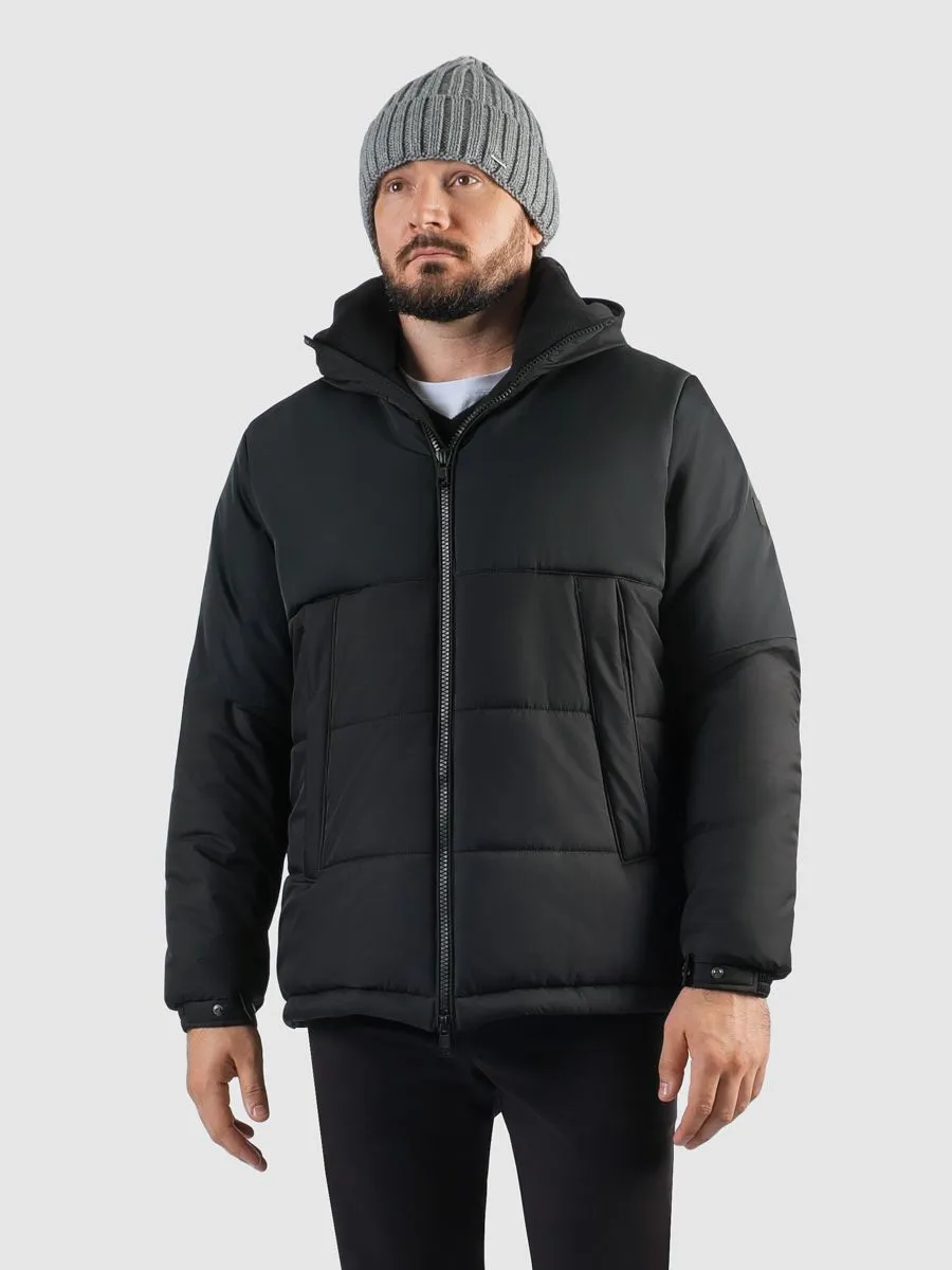 Черная мужская куртка с капюшоном. Ткань верха комбинированная. Утеплитель куртки текстон150 гр. Воротник, подклад капюшона и подклад карманов отделаны флисом. Карманы на куртке с двумя входами, один из которых на молнии. Объем манжетов можно регулировать при помощи кнопки.