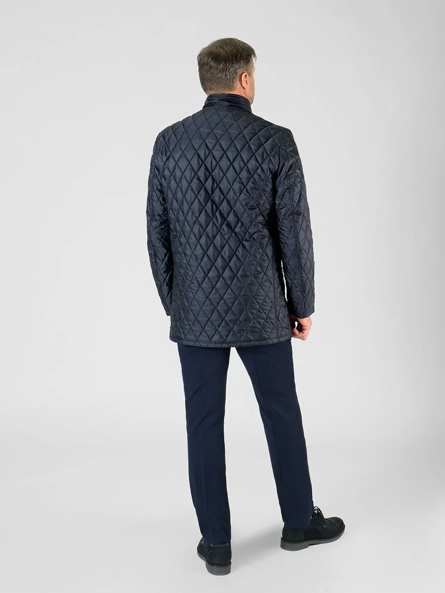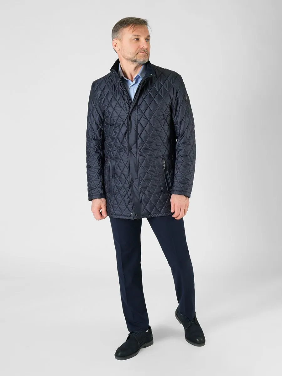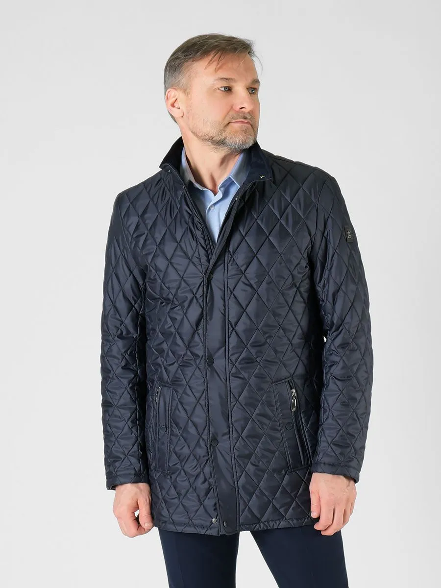 Демисезонная куртка для мужчин изготовлена из стеганной ткани, что хорошо видно по образовавшемуся рисунку в виде небольших ромбиков. У куртки удлиненный прямой силуэт, который позволяет легко надевать пиджаки различной длины. Застегивается куртка на центральную застежку-молнию, а сверху есть декоративная планка на кнопках. Заканчивается застежка воротником-стойкой, который имеет мягкую и нежную внутреннюю отделку в цвет основной ткани. Куртка имеет современный утеплитель холлофайбер, обладающий повышенной мягкостью, легкостью и эластичностью. Утеплитель позволяет обеспечить длительный комфорт при носке за счет сбалансированных показателей воздухопроницаемости, суммарного теплового сопротивления и влагоотведения из внутреннего пространства.