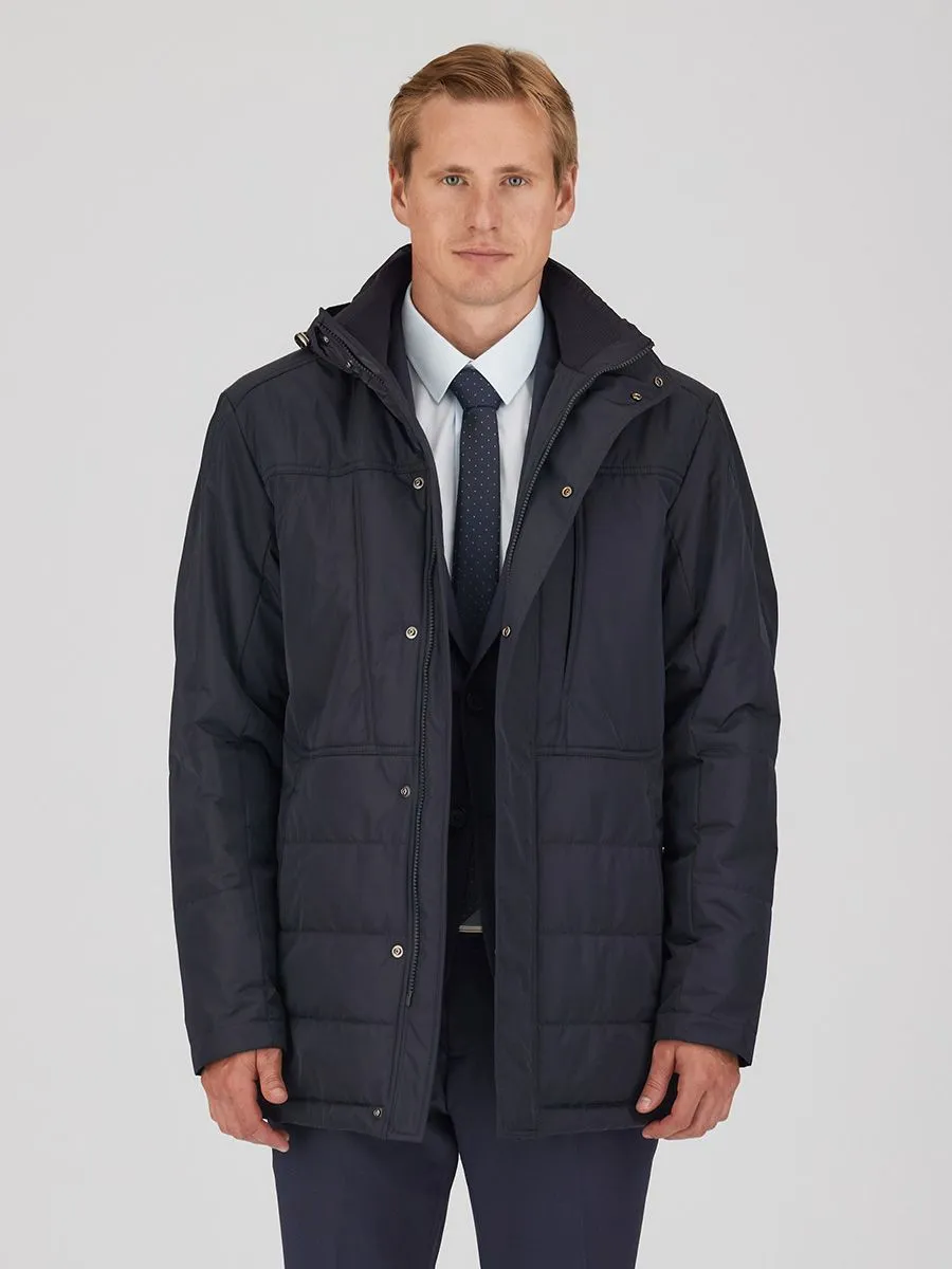 Мужская утепленная куртка удлиненного силуэта – идеальный выбор для тех, кто ценит комфорт и защиту от непогоды. Практичный капюшон, вместительный нагрудный карман и высокий ворот надежно защитят от ветра и холода. Застежка на молнию с дополнительной фиксацией кнопками гарантирует надежность, а регулируемые затяжки на капюшоне и по низу куртки позволяют подогнать посадку под индивидуальные предпочтения.
