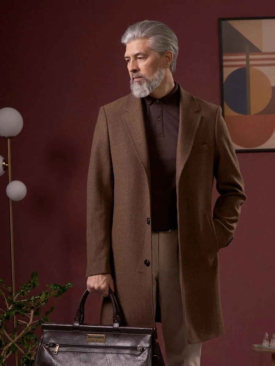 Рыжее шерстяное пальто — это воплощение осенней элегантности и практичности. Глубокий, теплый оттенок создает насыщенный и благородный образ, идеально вписывающийся в палитру прохладного сезона. Этот цвет обладает уникальной способностью сочетаться с большинством элементов мужского гардероба, от джинсов до классических костюмов, делая его универсальной основой для множества стилистических комбинаций.Особый характер модели придает традиционный рисунок «ёлочка», выполненный на плотной шерстяной ткани. Эта фактура — не просто декоративный элемент, а признак качественного материала и внимания к деталям. Она создает интересную игру света и тени, добавляя визуальную глубину и объем всему силуэту. Такой узор говорит о следовании классическим канонам пошива верхней одежды, обеспечивая одновременно респектабельный внешний вид и повышенную износостойкость ткани.Полуприлегающий силуэт не обтягивает фигуру, сохраняя свободу движений и комфорт, но при этом аккуратно следует ее линиям, подчеркивая плечи и создавая собранный, динамичный образ. Функциональность модели подчеркнута продуманной деталью — нагрудным карманом. Он не только служит удобным местом для хранения мелочей, но и выступает в роли стилистического акцента, завершая композицию и придавая ей целостность.Этот предмет гардероба представляет собой удачный синтез традиции и современности. Он наследует лучшие черты классического мужского пальто — достоинство, долговечность, четкую форму — и дополняет их актуальным, более непринужденным силуэтом. В результате получается вещь, которая не подвластна сиюминутным тенденциям, оставаясь в тренде благодаря своему безупречному качеству и вневременной эстетике.