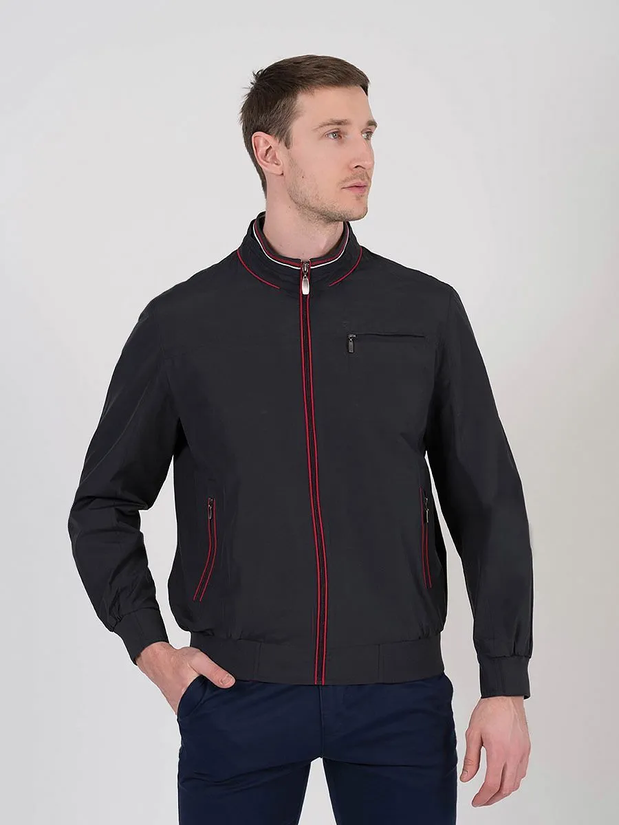 Темно-синяя ветровка будет актуальна весной, летом и осенью, особенно в ветреную и дождливую погоду. Ткань у ветровки настолько легкая, что ее можно надеть даже в теплую погоду или носить с собой в сумке на случай дождя. У ветровки контрастная белая и красная окантовка. Красным цветом окантованы три передних кармана, центральная застежка-молния и стойка. Полуподклад скомбинирован из синей подкладочной ткани и голубого меланжевого хлопка, имеется два внутренних кармана.
