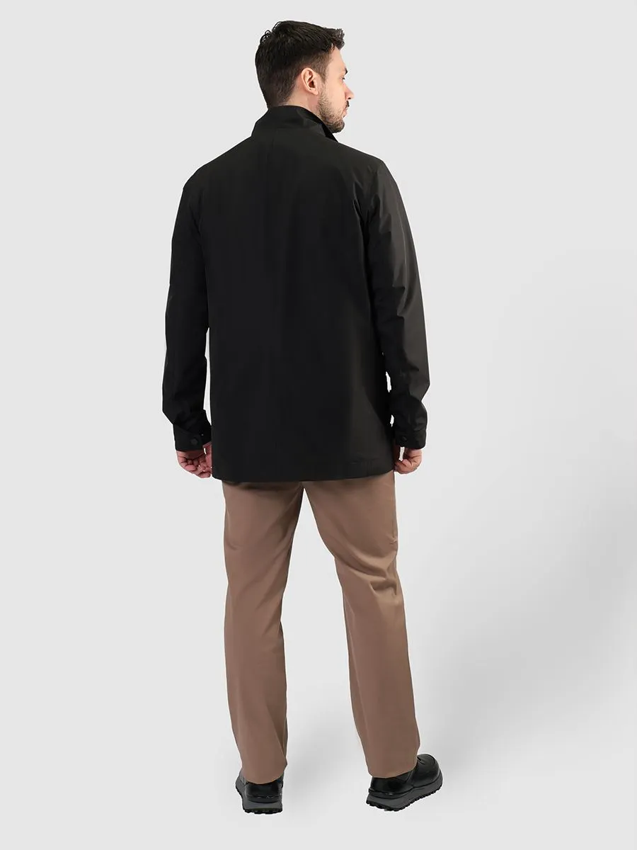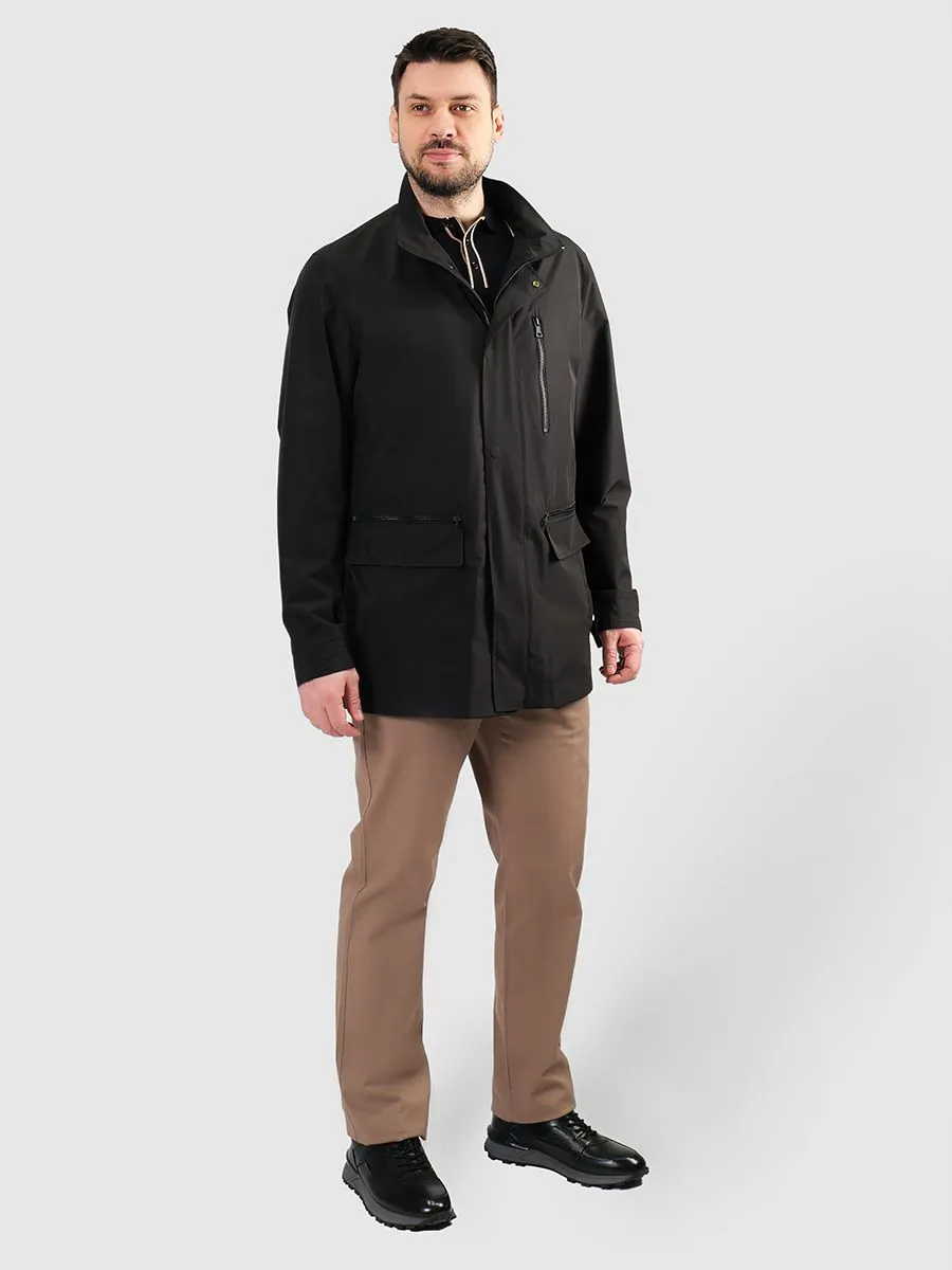 Удлиненная мужская ветровка, цвет: черный. Застежка на молнию и кнопки, воротник стойка, карманы на молнии – это не просто предмет гардероба, это инвестиция в комфорт и стиль на межсезонье. Такая ветровка становится надежным союзником в переменчивую погоду, обеспечивая защиту от ветра и небольшого дождя, при этом сохраняя презентабельный и современный внешний вид.