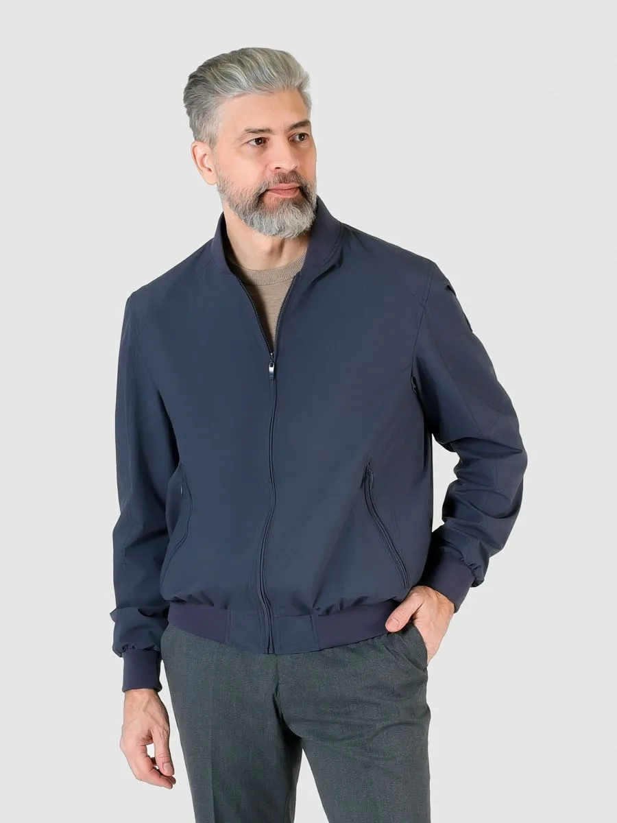 Синяя ветровка-бомбер идеально подойдет для стильных и модных повседневных образов. Благодаря водоотталкивающей пропитке она защитит вас от дождя и ветра, сохраняя комфорт и тепло. Надежные и стильные молнии "трактор" в тон ткани придают изделию элегантность и сдержанность. Мягкая резинка на воротнике, манжетах и поясе обеспечивает отличную посадку и комфорт при носке. Ветровка-бомбер легко впишется в любой гардероб и станет его неотъемленмой частью.