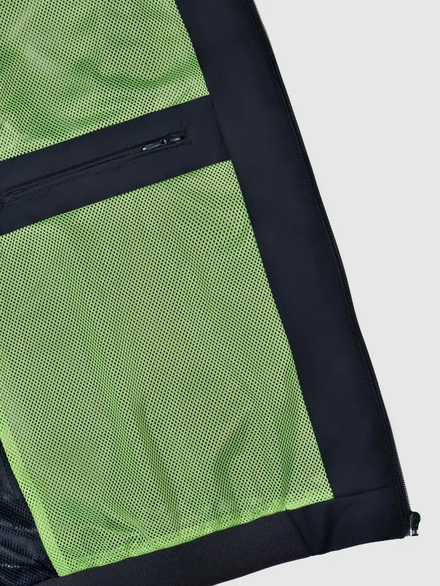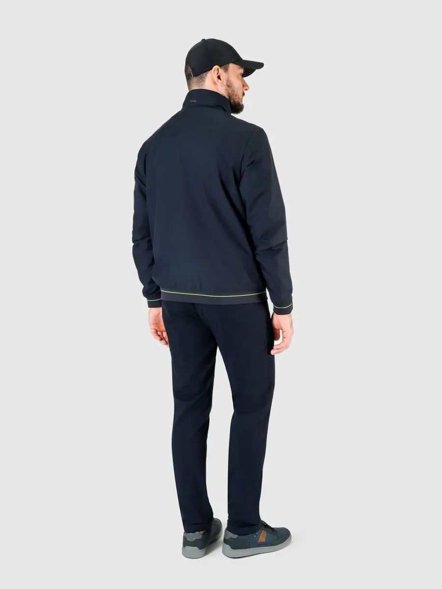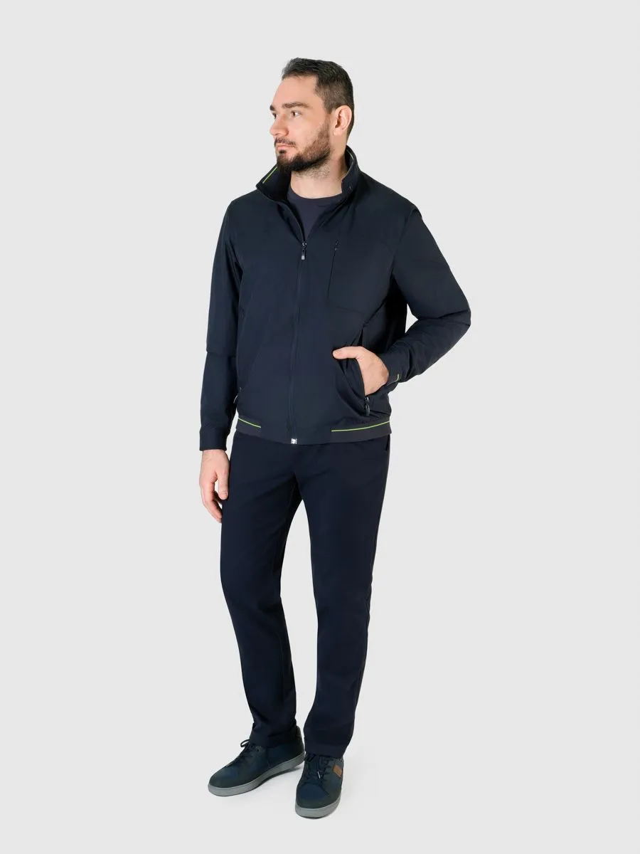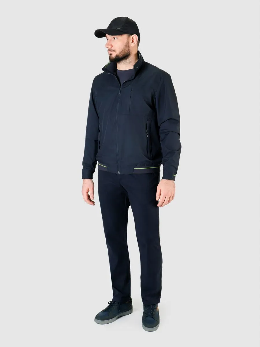 Ветровка укороченного силуэта в темно-синем цвете. У этой модели воротник-стойка с потайным капюшоном, который можно легко спрятать, когда он не нужен. Вшитые резинки с яркой салатовой полоской на нижней части куртки и на запястьях создают яркий образ куртки и при этом фунциональны - защищают от холода, благодря более плотному прилиганию куртки к телу. Нагрудный карман на молнии позволит вам удобно хранить и легко доставать полезные мелочи. Ветровка изготовлена из высококачественных материалов, которые обеспечивают защиту от ветра и легкую вентиляцию, что делает ее идеальной для использования во время прогулок или занятий спортом на открытом воздухе.Эта укороченная ветровка отлично дополнит ваш стильный и модный образ. Она подходит как для повседневной носки, так и для активных выездов за город.