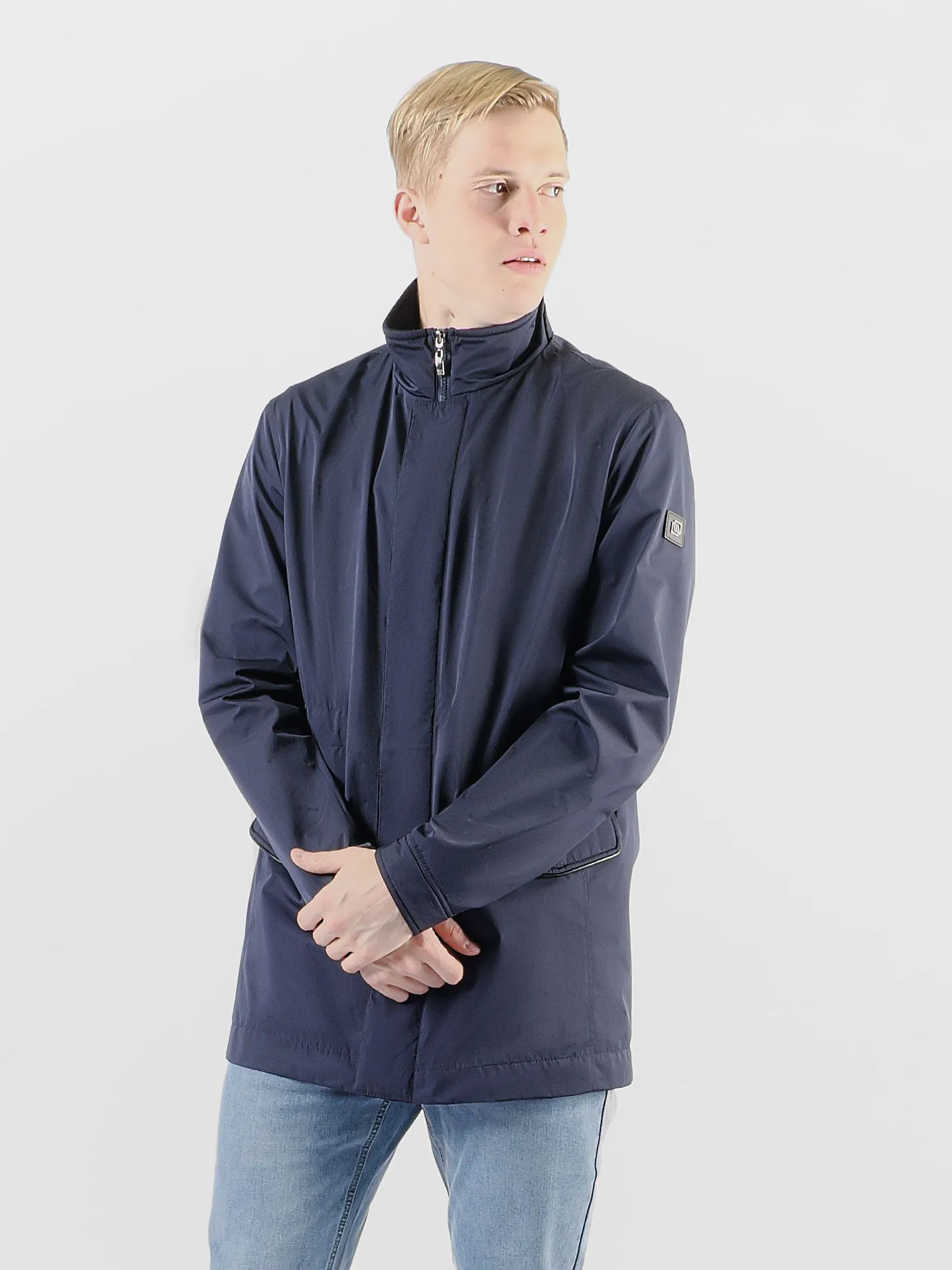 Мужская ветровка, удлиненная модель темно-синего цвета с воротником стойкой, выполнена из высококачественного материала, обеспечивающего защиту от ветра и дождя. Эта ветровка идеально подходит для тех, кто ценит стиль и комфорт в любую погоду. Темно-синий цвет придаёт изделию элегантность и универсальность, позволяя легко сочетать его с различными элементами гардероба. Ветровка оборудована удобными боковыми карманами на молнии, что делает её ещё более практичной. Элегантный воротник-стойка не только защищает шею от холодного ветра, но и придаёт модели современный и модный вид. Таким образом, данная ветровка становится незаменимой вещью в гардеробе каждого мужчины, который стремится выглядеть стильно независимо от погодных условий.