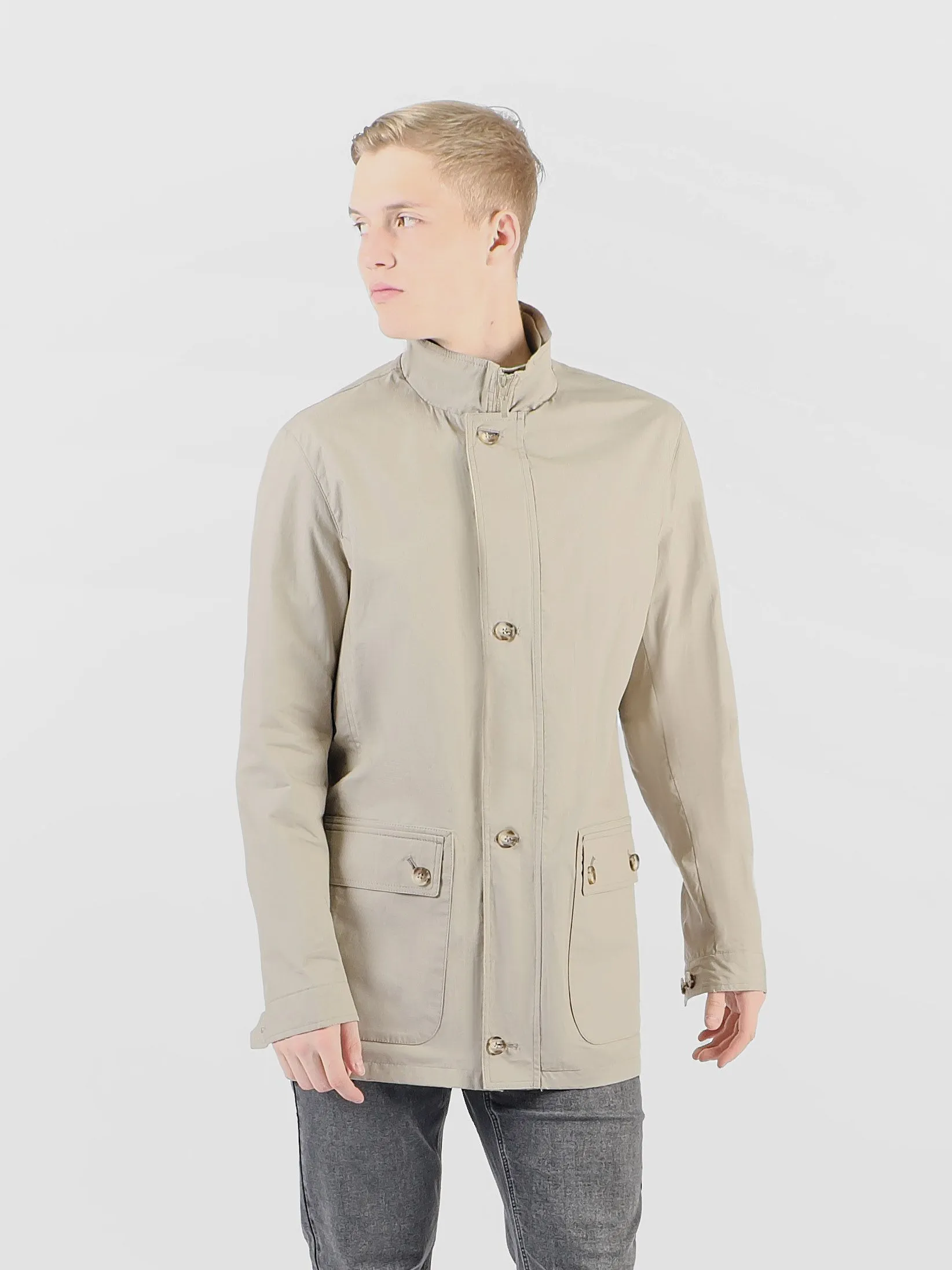 Мужская ветровка, выполненная в светло-бежевом оттенке, является прекрасным выбором для прохладных дней межсезонья. Воротник стойка придаёт изделию элегантный и современный вид, гармонично дополняя общий дизайн. Материал на 100% состоит из высококачественного хлопка, обеспечивающего исключительную мягкость и комфорт при носке. Такая ветровка не только практична, но и стильна, позволяя её владельцу всегда выглядеть модно и чувствовать себя уверенно в любой ситуации. Это идеальное сочетание классики и современности в мире мужской одежды, удовлетворяющее самые высокие эстетические требования.