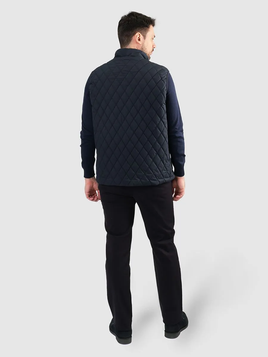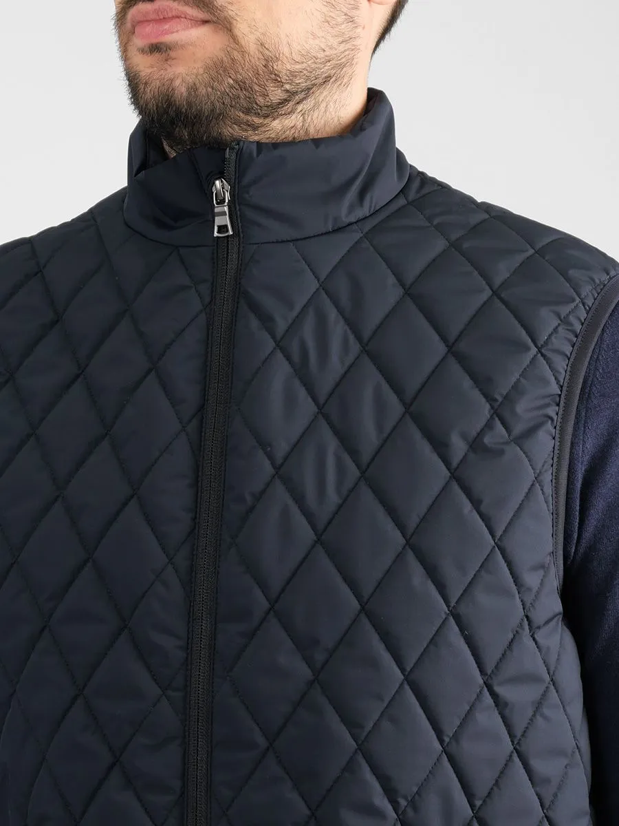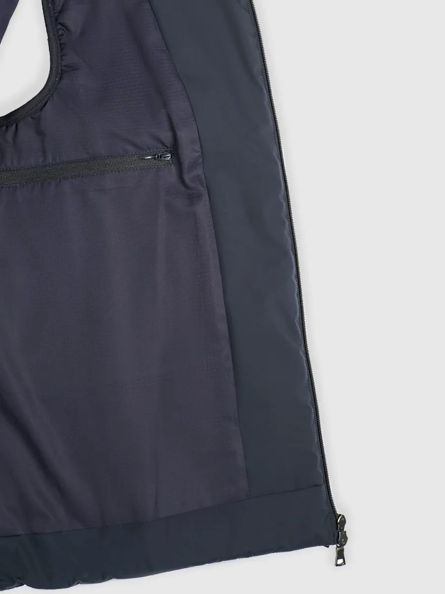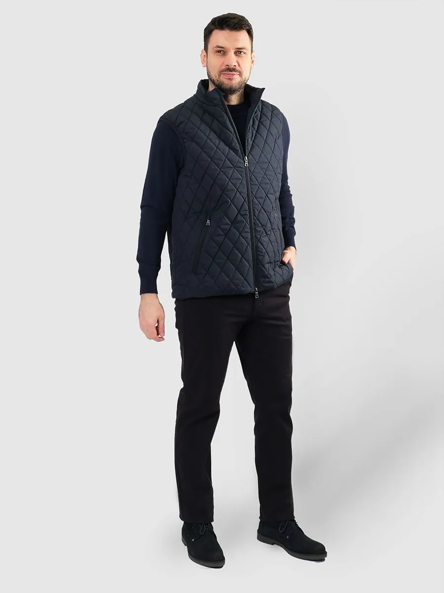 Утепленный синий жилет идеально подходит для межсезонья или в качестве дополнительного слоя в холодную погоду. Жилет обеспечивает свободу движений, не сковывая, как куртка, и сохраняет тепло корпуса, защищая от ветра. Стежка в форме ромба не только придает жилету элегантный вид, но и обеспечивает равномерное распределение утеплителя, предотвращая его сбивание и образование холодных зон.Удобная застежка на молнию позволяет быстро и легко надевать и снимать жилет, а также регулировать степень защиты от холода.